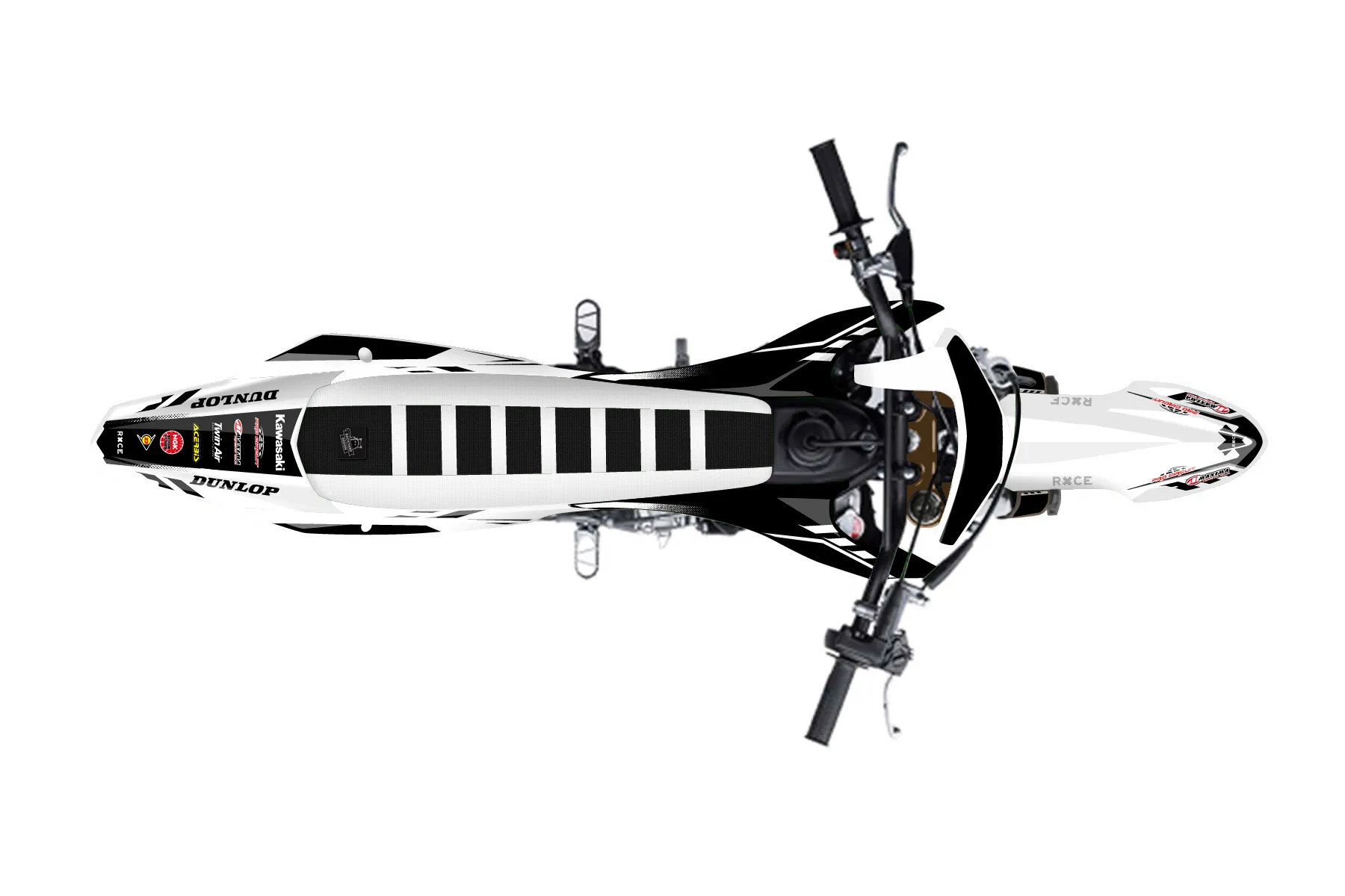 «Pattern» — готовый комплект графики серии Maverick для Kawasaki MX Graphic Kit Kawasaki KX 85 2014. В комплекте: графика на бак и боковые облицовки, крылья (переднее и заднее), передний щиток, номерные таблички, защита вилки. Материал: ПВХ-винил 80 мкр с холодной ламинацией 300 мкр, общая толщина 380 мкр; покрытие глянцевое или матовое на выбор. Устойчив к UV-излучению, воде, бензину и мойке высокого давления. Клей акриловый на сольвентной основе — постоянный, для гибких пластиков. На простых поверхностях монтируется без нагрева; для сложных изгибов рекомендуем фен. Этот пресет можно заказать как есть или взять за основу в конструкторе: поменять цвета, добавить стартовый номер и свой бренд. Производство — 3–5 рабочих дней, доставка по России СДЭКом или Почтой, по СНГ — курьерскими службами.