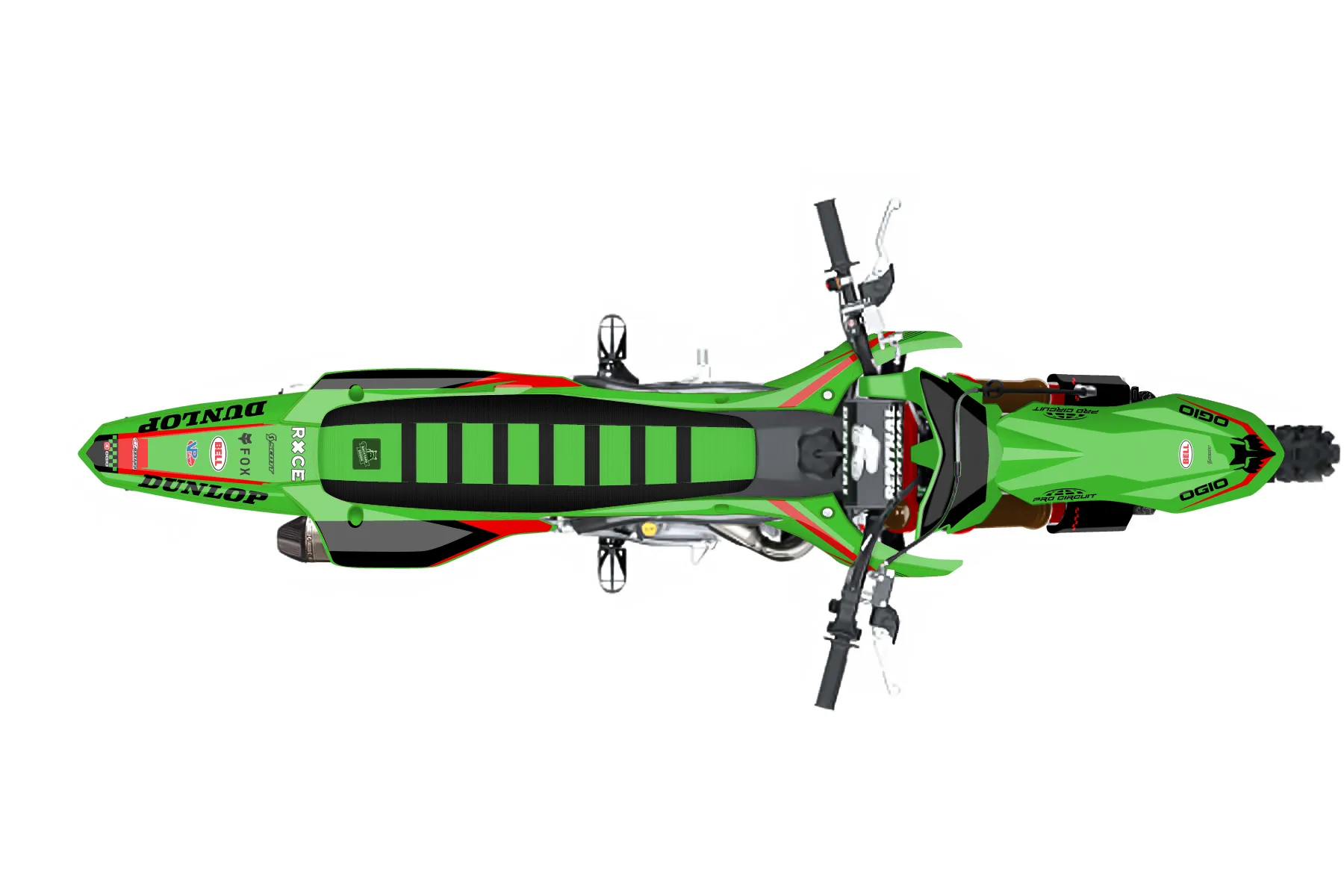 «CustomDesign» — готовый комплект графики серии Staple для Kawasaki MX Graphic Kit Kawasaki KX250F 2021. В комплекте: графика на бак и боковые облицовки, крылья (переднее и заднее), передний щиток, номерные таблички, защита вилки. Материал: ПВХ-винил 80 мкр с холодной ламинацией 300 мкр, общая толщина 380 мкр; покрытие глянцевое или матовое на выбор. Устойчив к UV-излучению, воде, бензину и мойке высокого давления. Клей акриловый на сольвентной основе — постоянный, для гибких пластиков. На простых поверхностях монтируется без нагрева; для сложных изгибов рекомендуем фен. Этот пресет можно заказать как есть или взять за основу в конструкторе: поменять цвета, добавить стартовый номер и свой бренд. Производство — 3–5 рабочих дней, доставка по России СДЭКом или Почтой, по СНГ — курьерскими службами.