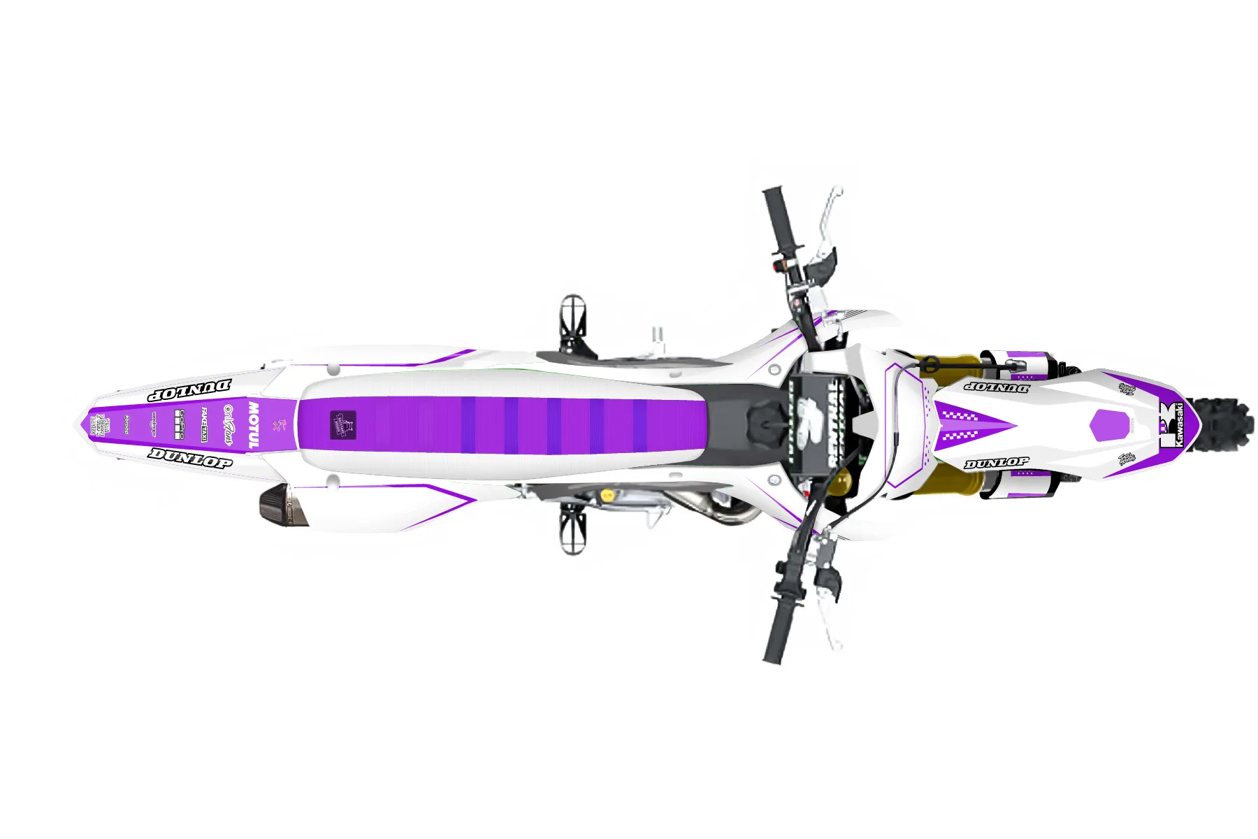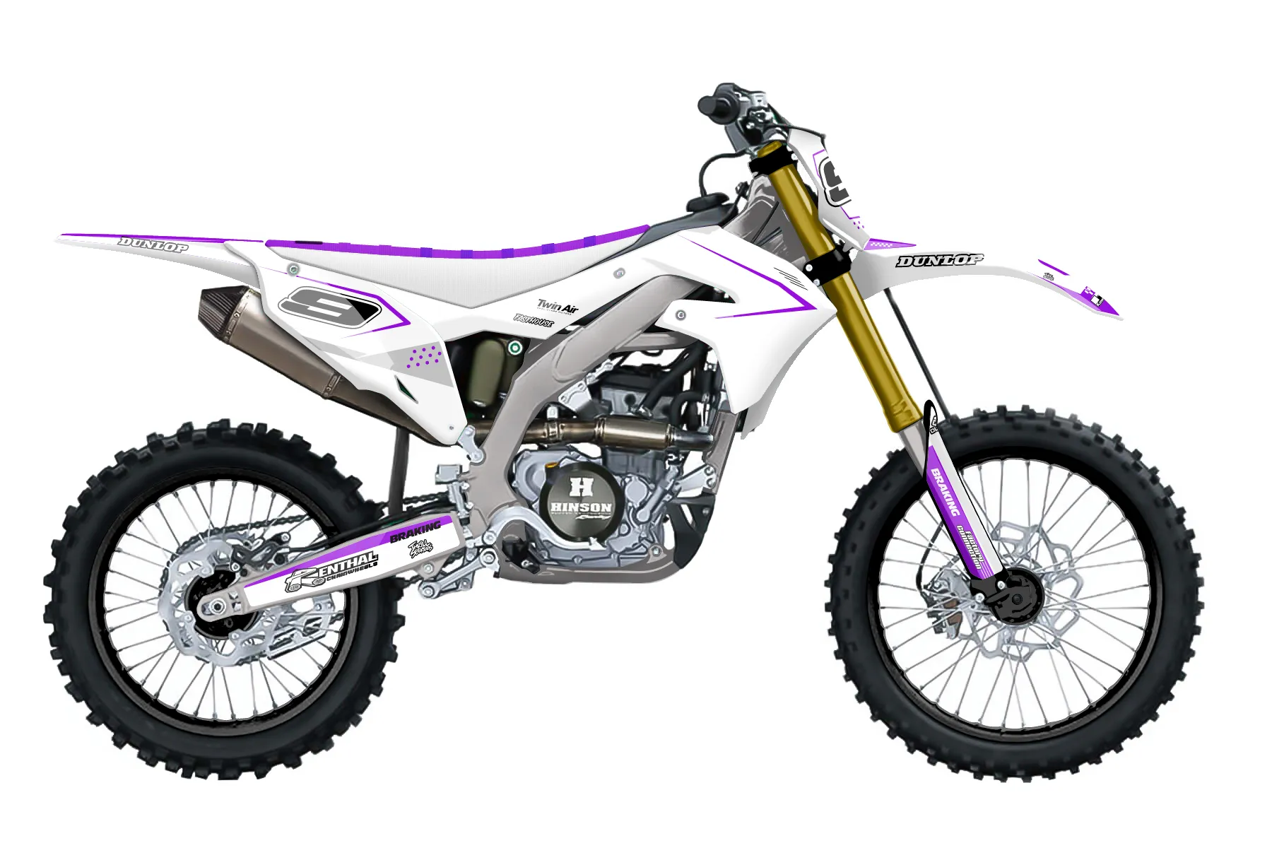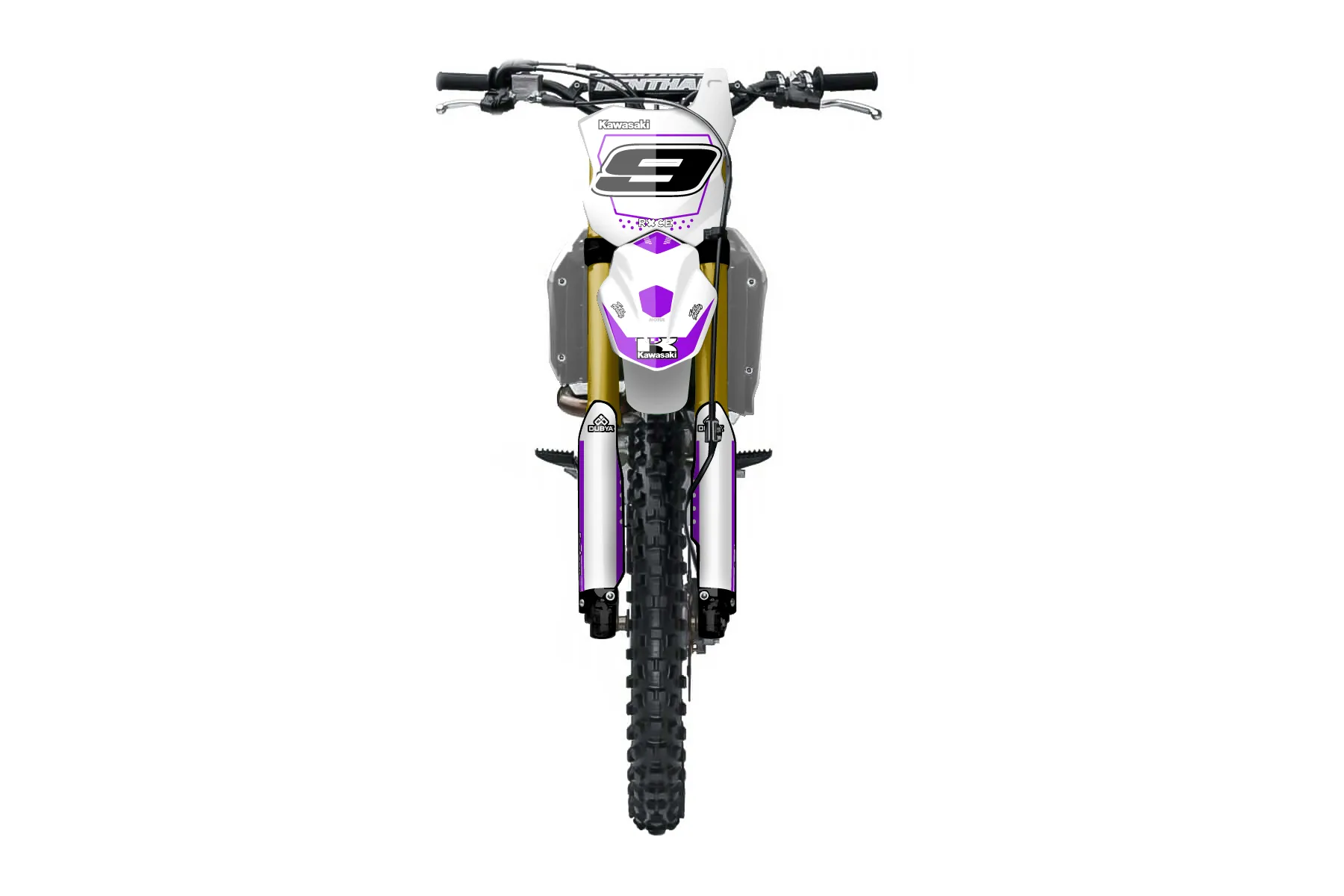 «kx250 white purple 2» — готовый комплект графики серии Staple для Kawasaki MX Graphic Kit Kawasaki KX250F 2021. В комплекте: графика на бак и боковые облицовки, крылья (переднее и заднее), передний щиток, номерные таблички, защита вилки. Материал: ПВХ-винил 80 мкр с холодной ламинацией 300 мкр, общая толщина 380 мкр; покрытие глянцевое или матовое на выбор. Устойчив к UV-излучению, воде, бензину и мойке высокого давления. Клей акриловый на сольвентной основе — постоянный, для гибких пластиков. На простых поверхностях монтируется без нагрева; для сложных изгибов рекомендуем фен. Этот пресет можно заказать как есть или взять за основу в конструкторе: поменять цвета, добавить стартовый номер и свой бренд. Производство — 3–5 рабочих дней, доставка по России СДЭКом или Почтой, по СНГ — курьерскими службами.