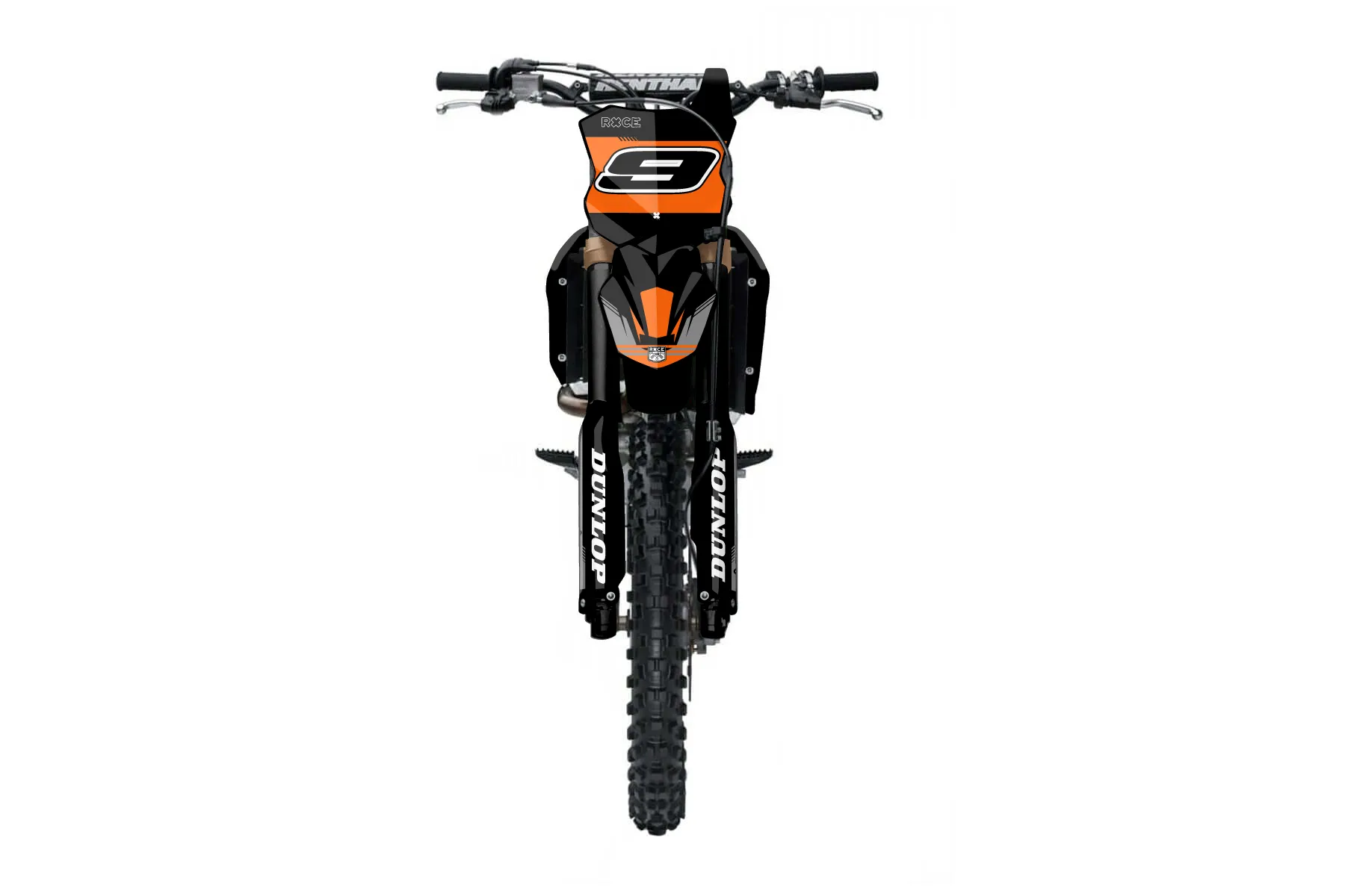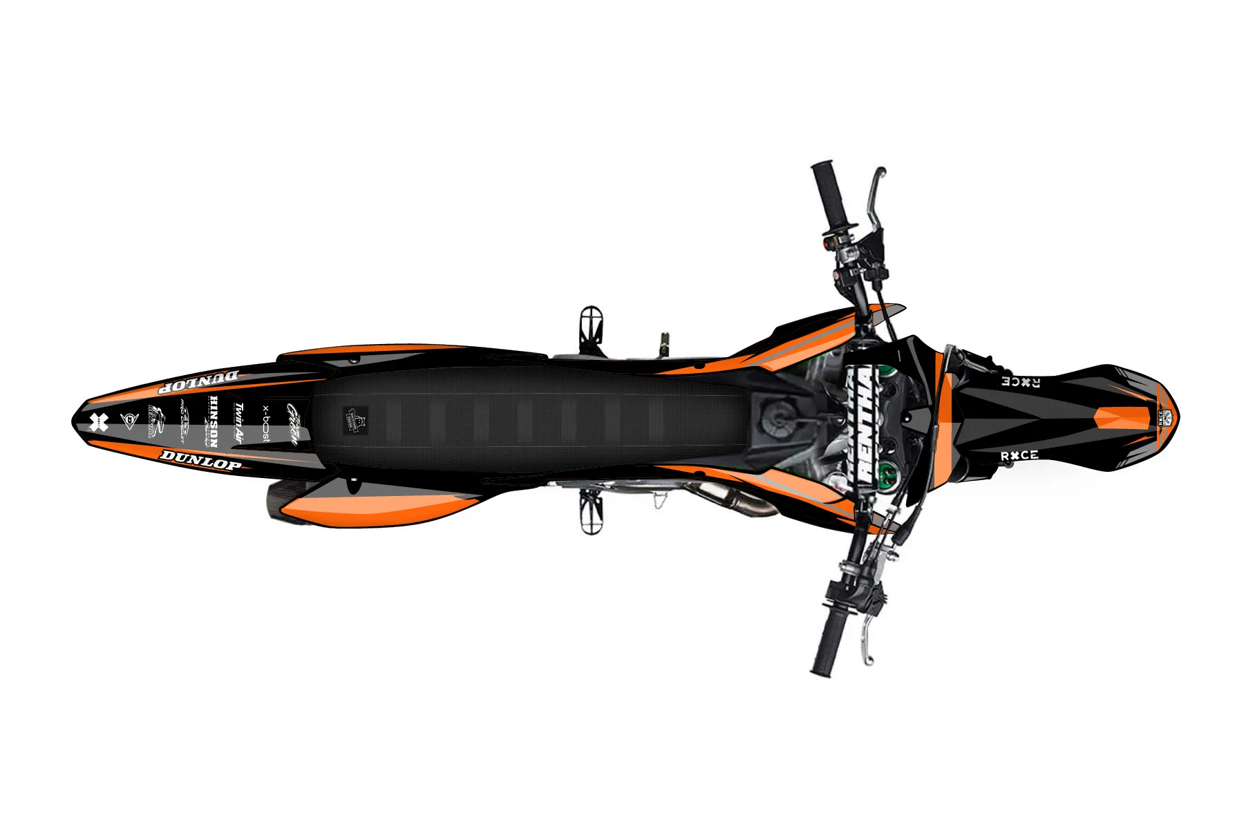«KX450 black/orange» — готовый комплект графики серии Untucked для Kawasaki MX Graphic Kit Kawasaki KX450F 2016. В комплекте: графика на бак и боковые облицовки, крылья (переднее и заднее), передний щиток, номерные таблички, защита вилки. Материал: ПВХ-винил 80 мкр с холодной ламинацией 300 мкр, общая толщина 380 мкр; покрытие глянцевое или матовое на выбор. Устойчив к UV-излучению, воде, бензину и мойке высокого давления. Клей акриловый на сольвентной основе — постоянный, для гибких пластиков. На простых поверхностях монтируется без нагрева; для сложных изгибов рекомендуем фен. Этот пресет можно заказать как есть или взять за основу в конструкторе: поменять цвета, добавить стартовый номер и свой бренд. Производство — 3–5 рабочих дней, доставка по России СДЭКом или Почтой, по СНГ — курьерскими службами.