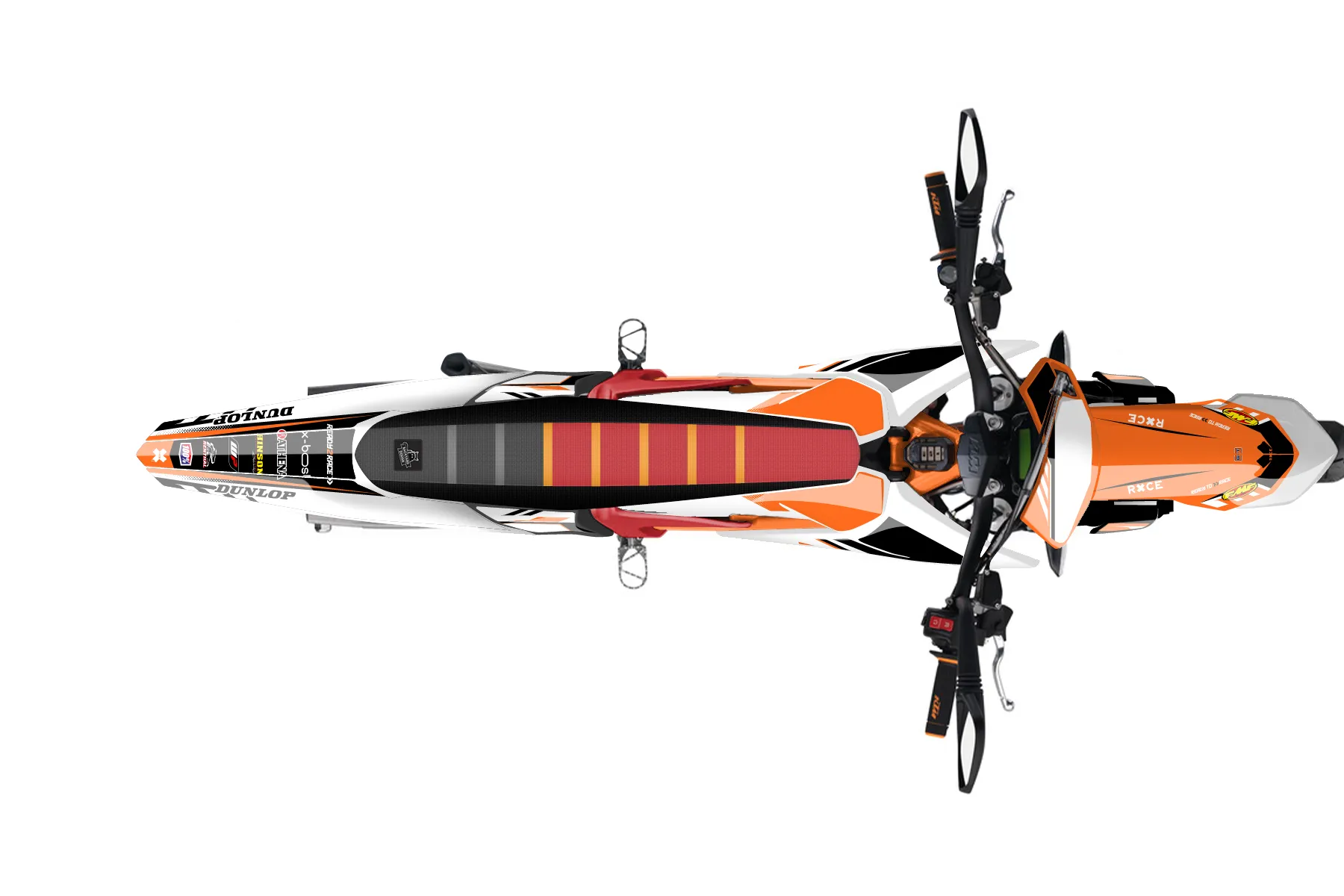 «Club» — готовый комплект графики серии Maverick для KTM MX Graphic Kit KTM E-SX Freeride 2012. В комплекте: графика на бак и боковые облицовки, крылья (переднее и заднее), передний щиток, номерные таблички, защита вилки. Материал: ПВХ-винил 80 мкр с холодной ламинацией 300 мкр, общая толщина 380 мкр; покрытие глянцевое или матовое на выбор. Устойчив к UV-излучению, воде, бензину и мойке высокого давления. Клей акриловый на сольвентной основе — постоянный, для гибких пластиков. На простых поверхностях монтируется без нагрева; для сложных изгибов рекомендуем фен. Этот пресет можно заказать как есть или взять за основу в конструкторе: поменять цвета, добавить стартовый номер и свой бренд. Производство — 3–5 рабочих дней, доставка по России СДЭКом или Почтой, по СНГ — курьерскими службами.
