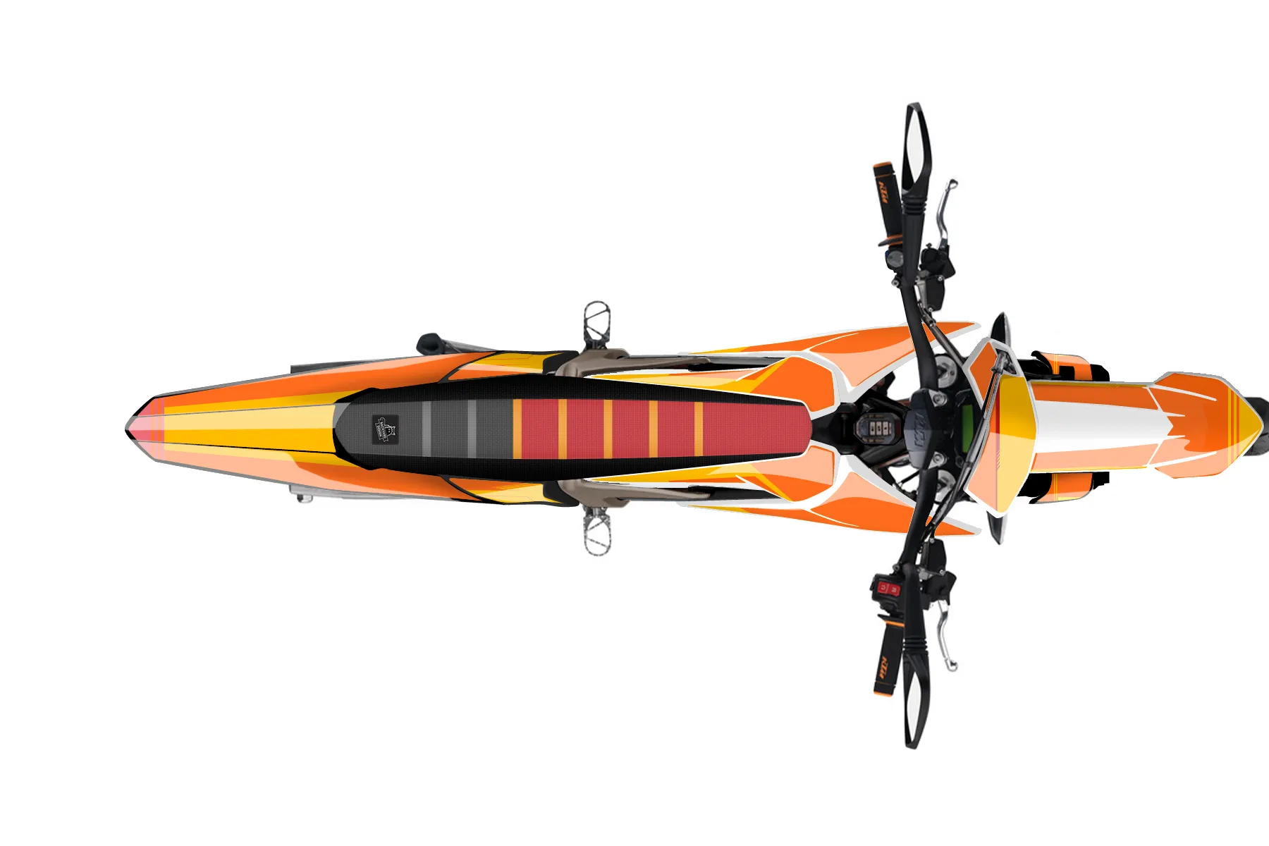 «tangerine» — готовый комплект графики серии Untucked для KTM MX Graphic Kit KTM E-XC Freeride 2019. В комплекте: графика на бак и боковые облицовки, крылья (переднее и заднее), передний щиток, номерные таблички, защита вилки. Материал: ПВХ-винил 80 мкр с холодной ламинацией 300 мкр, общая толщина 380 мкр; покрытие глянцевое или матовое на выбор. Устойчив к UV-излучению, воде, бензину и мойке высокого давления. Клей акриловый на сольвентной основе — постоянный, для гибких пластиков. На простых поверхностях монтируется без нагрева; для сложных изгибов рекомендуем фен. Этот пресет можно заказать как есть или взять за основу в конструкторе: поменять цвета, добавить стартовый номер и свой бренд. Производство — 3–5 рабочих дней, доставка по России СДЭКом или Почтой, по СНГ — курьерскими службами.