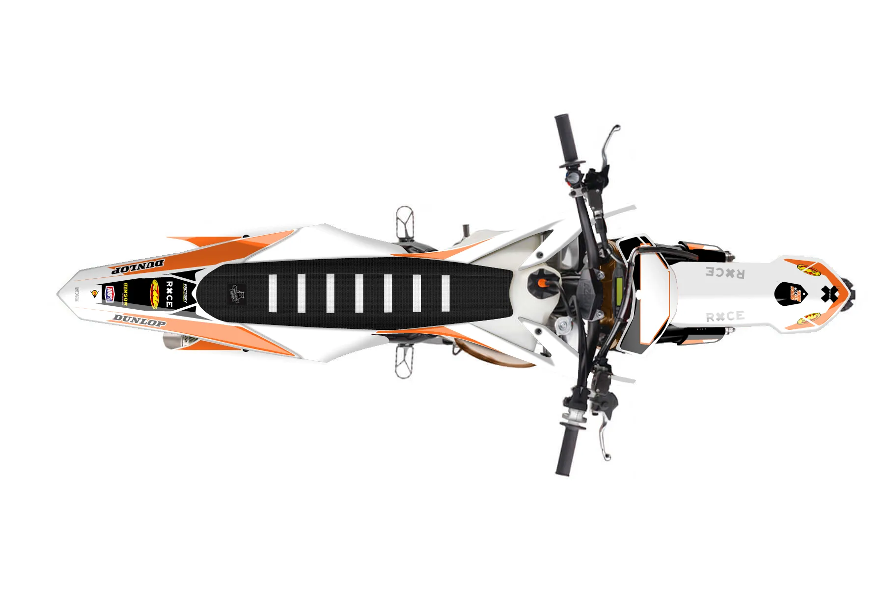 «Tilled» — готовый комплект графики серии Staple для KTM MX Graphic Kit KTM SX 125 2015. В комплекте: графика на бак и боковые облицовки, крылья (переднее и заднее), передний щиток, номерные таблички, защита вилки. Материал: ПВХ-винил 80 мкр с холодной ламинацией 300 мкр, общая толщина 380 мкр; покрытие глянцевое или матовое на выбор. Устойчив к UV-излучению, воде, бензину и мойке высокого давления. Клей акриловый на сольвентной основе — постоянный, для гибких пластиков. На простых поверхностях монтируется без нагрева; для сложных изгибов рекомендуем фен. Этот пресет можно заказать как есть или взять за основу в конструкторе: поменять цвета, добавить стартовый номер и свой бренд. Производство — 3–5 рабочих дней, доставка по России СДЭКом или Почтой, по СНГ — курьерскими службами.