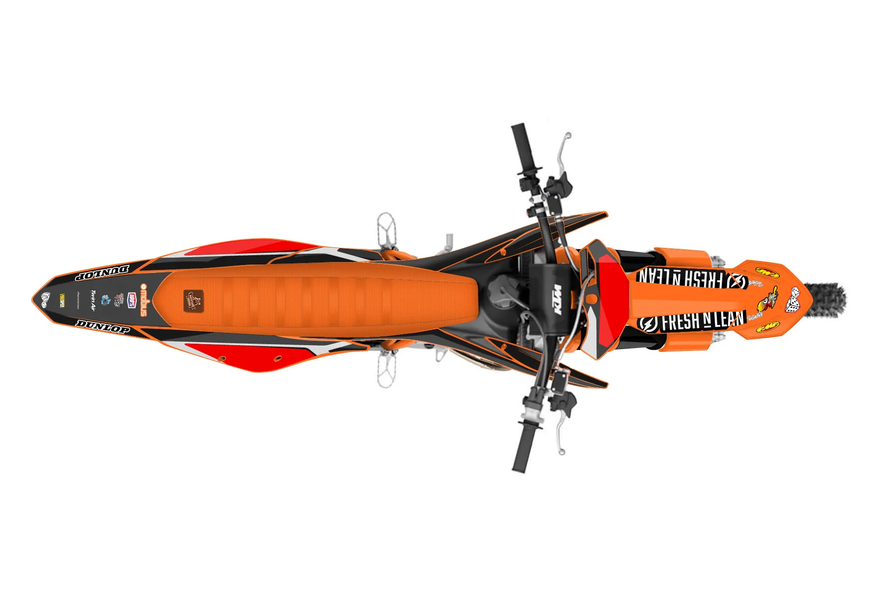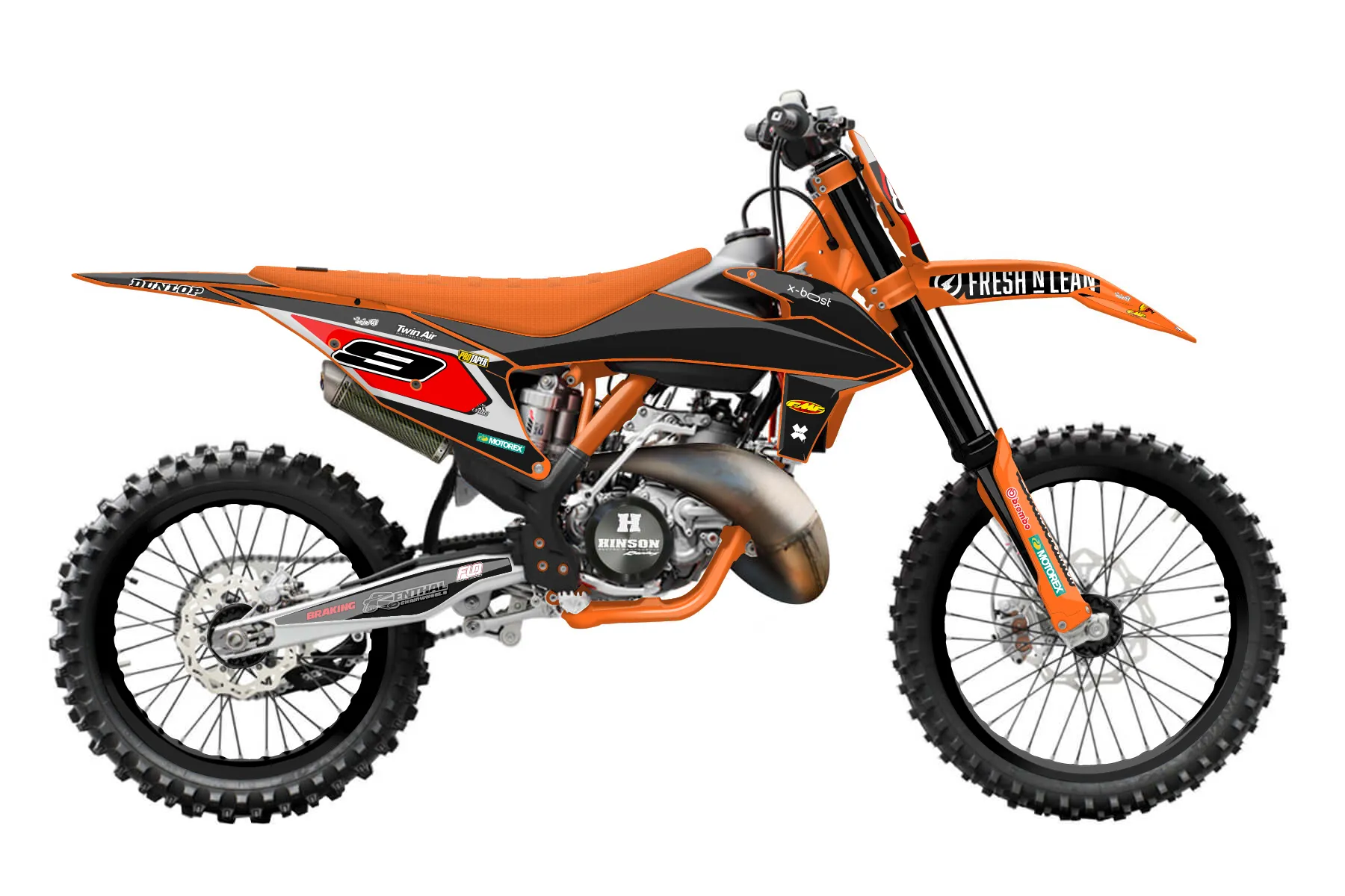 «newest design for ktm 125» — готовый комплект графики серии Flow для KTM MX Graphic Kit KTM SX 125 2019. В комплекте: графика на бак и боковые облицовки, крылья (переднее и заднее), передний щиток, номерные таблички, защита вилки. Материал: ПВХ-винил 80 мкр с холодной ламинацией 300 мкр, общая толщина 380 мкр; покрытие глянцевое или матовое на выбор. Устойчив к UV-излучению, воде, бензину и мойке высокого давления. Клей акриловый на сольвентной основе — постоянный, для гибких пластиков. На простых поверхностях монтируется без нагрева; для сложных изгибов рекомендуем фен. Этот пресет можно заказать как есть или взять за основу в конструкторе: поменять цвета, добавить стартовый номер и свой бренд. Производство — 3–5 рабочих дней, доставка по России СДЭКом или Почтой, по СНГ — курьерскими службами.
