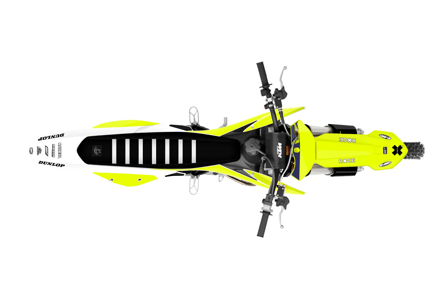 «Rise Fluo» — готовый комплект графики серии Flow для KTM MX Graphic Kit KTM SX 125 2019. В комплекте: графика на бак и боковые облицовки, крылья (переднее и заднее), передний щиток, номерные таблички, защита вилки. Материал: ПВХ-винил 80 мкр с холодной ламинацией 300 мкр, общая толщина 380 мкр; покрытие глянцевое или матовое на выбор. Устойчив к UV-излучению, воде, бензину и мойке высокого давления. Клей акриловый на сольвентной основе — постоянный, для гибких пластиков. На простых поверхностях монтируется без нагрева; для сложных изгибов рекомендуем фен. Этот пресет можно заказать как есть или взять за основу в конструкторе: поменять цвета, добавить стартовый номер и свой бренд. Производство — 3–5 рабочих дней, доставка по России СДЭКом или Почтой, по СНГ — курьерскими службами.