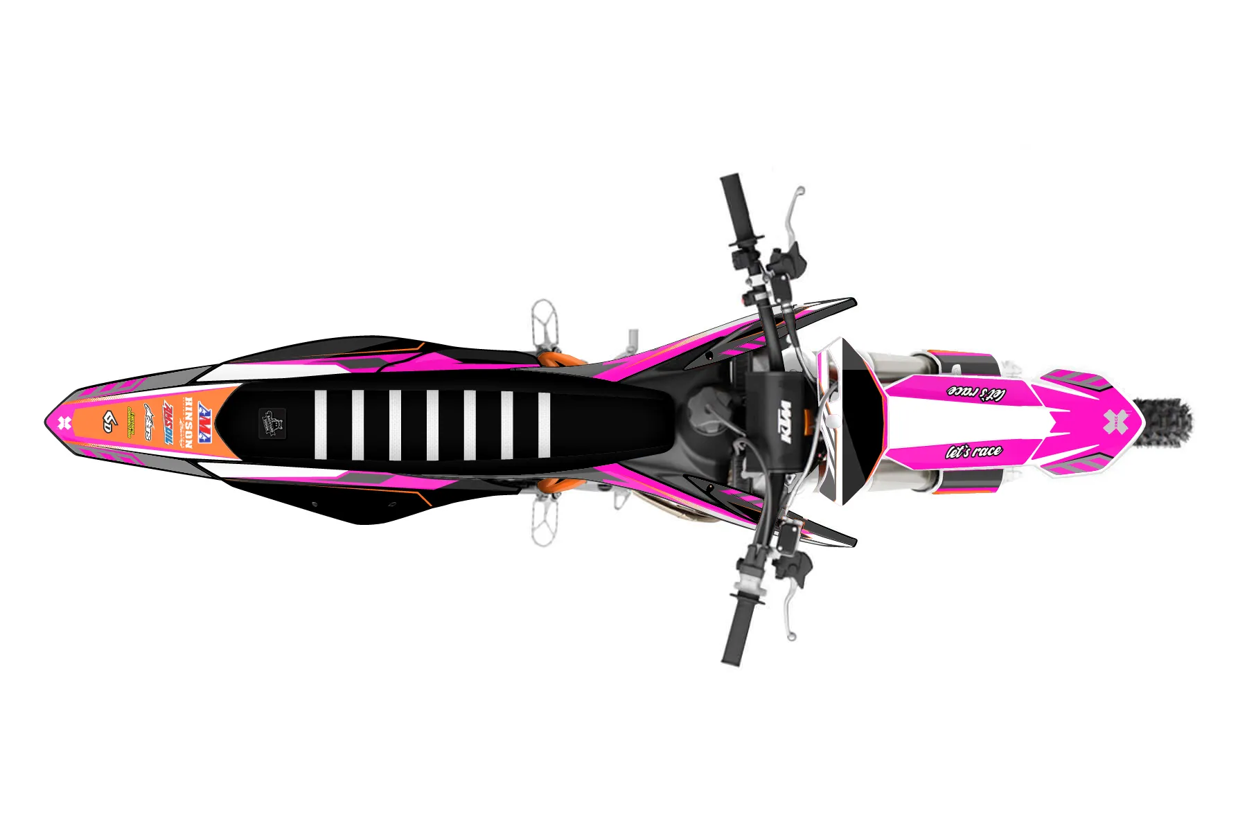 «haydie» — готовый комплект графики серии Maverick для KTM MX Graphic Kit KTM SX 125 2019. В комплекте: графика на бак и боковые облицовки, крылья (переднее и заднее), передний щиток, номерные таблички, защита вилки. Материал: ПВХ-винил 80 мкр с холодной ламинацией 300 мкр, общая толщина 380 мкр; покрытие глянцевое или матовое на выбор. Устойчив к UV-излучению, воде, бензину и мойке высокого давления. Клей акриловый на сольвентной основе — постоянный, для гибких пластиков. На простых поверхностях монтируется без нагрева; для сложных изгибов рекомендуем фен. Этот пресет можно заказать как есть или взять за основу в конструкторе: поменять цвета, добавить стартовый номер и свой бренд. Производство — 3–5 рабочих дней, доставка по России СДЭКом или Почтой, по СНГ — курьерскими службами.