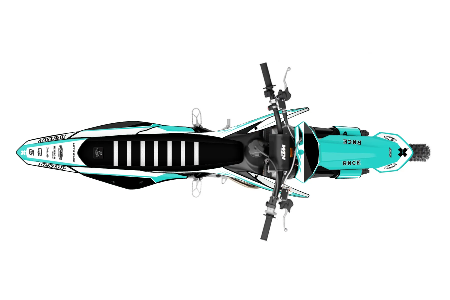 «ktm 2020 125sx white mint blue» — готовый комплект графики серии Maverick для KTM MX Graphic Kit KTM SX 125 2019. В комплекте: графика на бак и боковые облицовки, крылья (переднее и заднее), передний щиток, номерные таблички, защита вилки. Материал: ПВХ-винил 80 мкр с холодной ламинацией 300 мкр, общая толщина 380 мкр; покрытие глянцевое или матовое на выбор. Устойчив к UV-излучению, воде, бензину и мойке высокого давления. Клей акриловый на сольвентной основе — постоянный, для гибких пластиков. На простых поверхностях монтируется без нагрева; для сложных изгибов рекомендуем фен. Этот пресет можно заказать как есть или взять за основу в конструкторе: поменять цвета, добавить стартовый номер и свой бренд. Производство — 3–5 рабочих дней, доставка по России СДЭКом или Почтой, по СНГ — курьерскими службами.