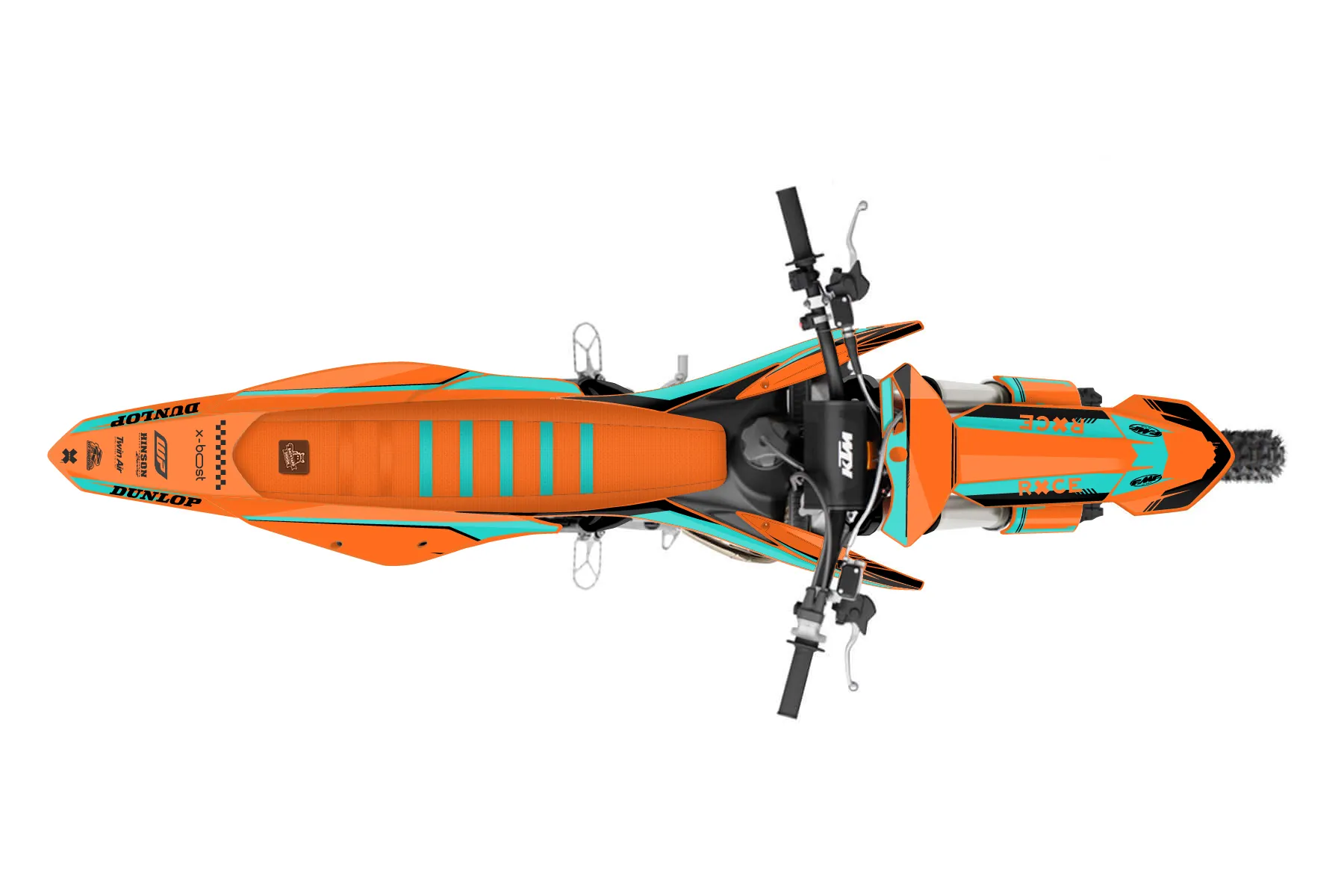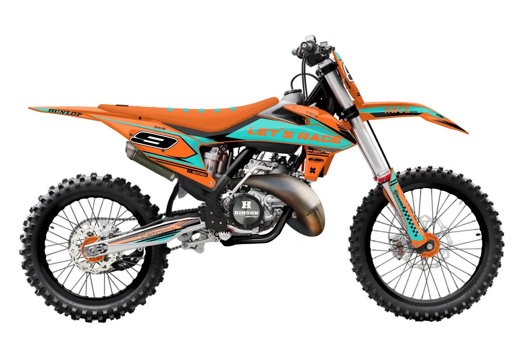 «teal and orange» — готовый комплект графики серии Untucked для KTM MX Graphic Kit KTM SX 125 2019. В комплекте: графика на бак и боковые облицовки, крылья (переднее и заднее), передний щиток, номерные таблички, защита вилки. Материал: ПВХ-винил 80 мкр с холодной ламинацией 300 мкр, общая толщина 380 мкр; покрытие глянцевое или матовое на выбор. Устойчив к UV-излучению, воде, бензину и мойке высокого давления. Клей акриловый на сольвентной основе — постоянный, для гибких пластиков. На простых поверхностях монтируется без нагрева; для сложных изгибов рекомендуем фен. Этот пресет можно заказать как есть или взять за основу в конструкторе: поменять цвета, добавить стартовый номер и свой бренд. Производство — 3–5 рабочих дней, доставка по России СДЭКом или Почтой, по СНГ — курьерскими службами.