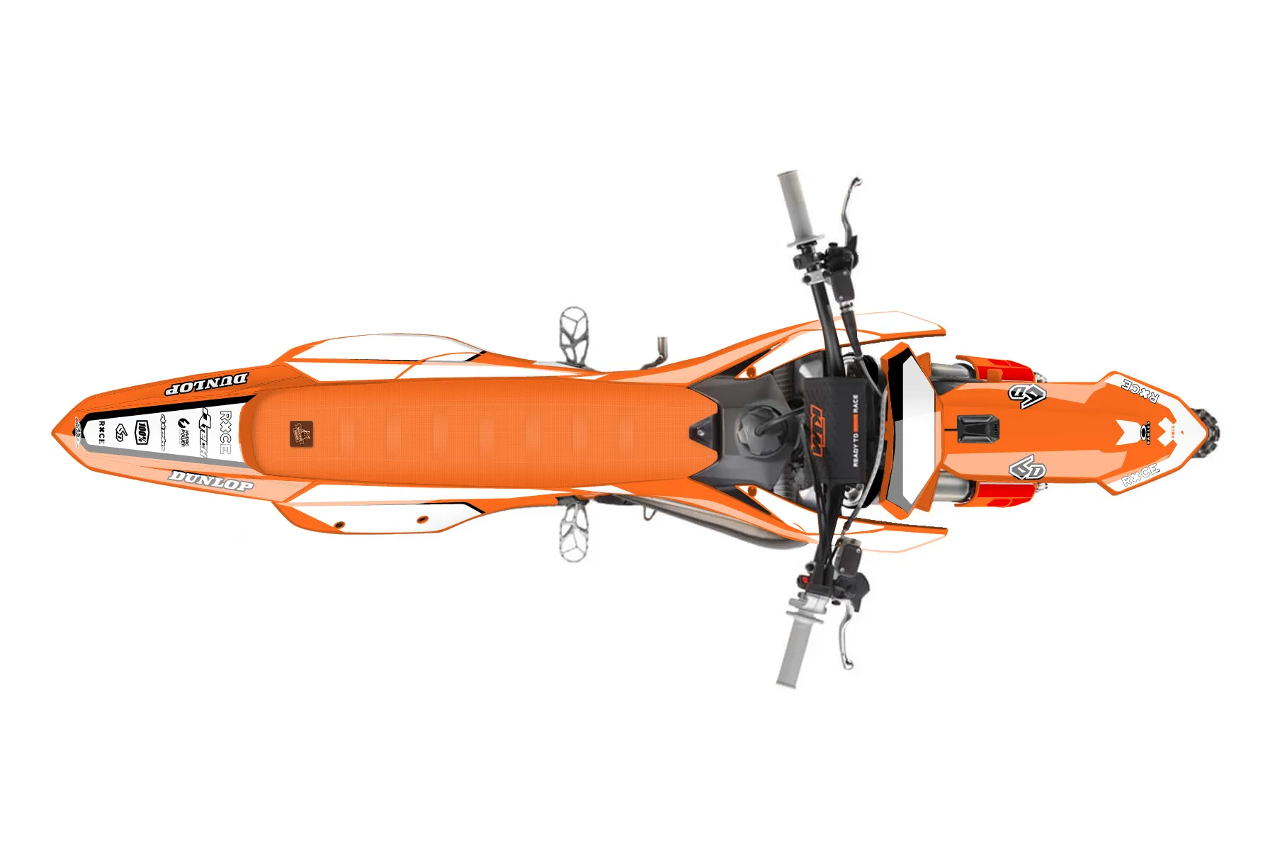 «CustomDesign 2» — готовый комплект графики серии Flow для KTM MX Graphic Kit KTM SX 125 2025. В комплекте: графика на бак и боковые облицовки, крылья (переднее и заднее), передний щиток, номерные таблички, защита вилки. Материал: ПВХ-винил 80 мкр с холодной ламинацией 300 мкр, общая толщина 380 мкр; покрытие глянцевое или матовое на выбор. Устойчив к UV-излучению, воде, бензину и мойке высокого давления. Клей акриловый на сольвентной основе — постоянный, для гибких пластиков. На простых поверхностях монтируется без нагрева; для сложных изгибов рекомендуем фен. Этот пресет можно заказать как есть или взять за основу в конструкторе: поменять цвета, добавить стартовый номер и свой бренд. Производство — 3–5 рабочих дней, доставка по России СДЭКом или Почтой, по СНГ — курьерскими службами.