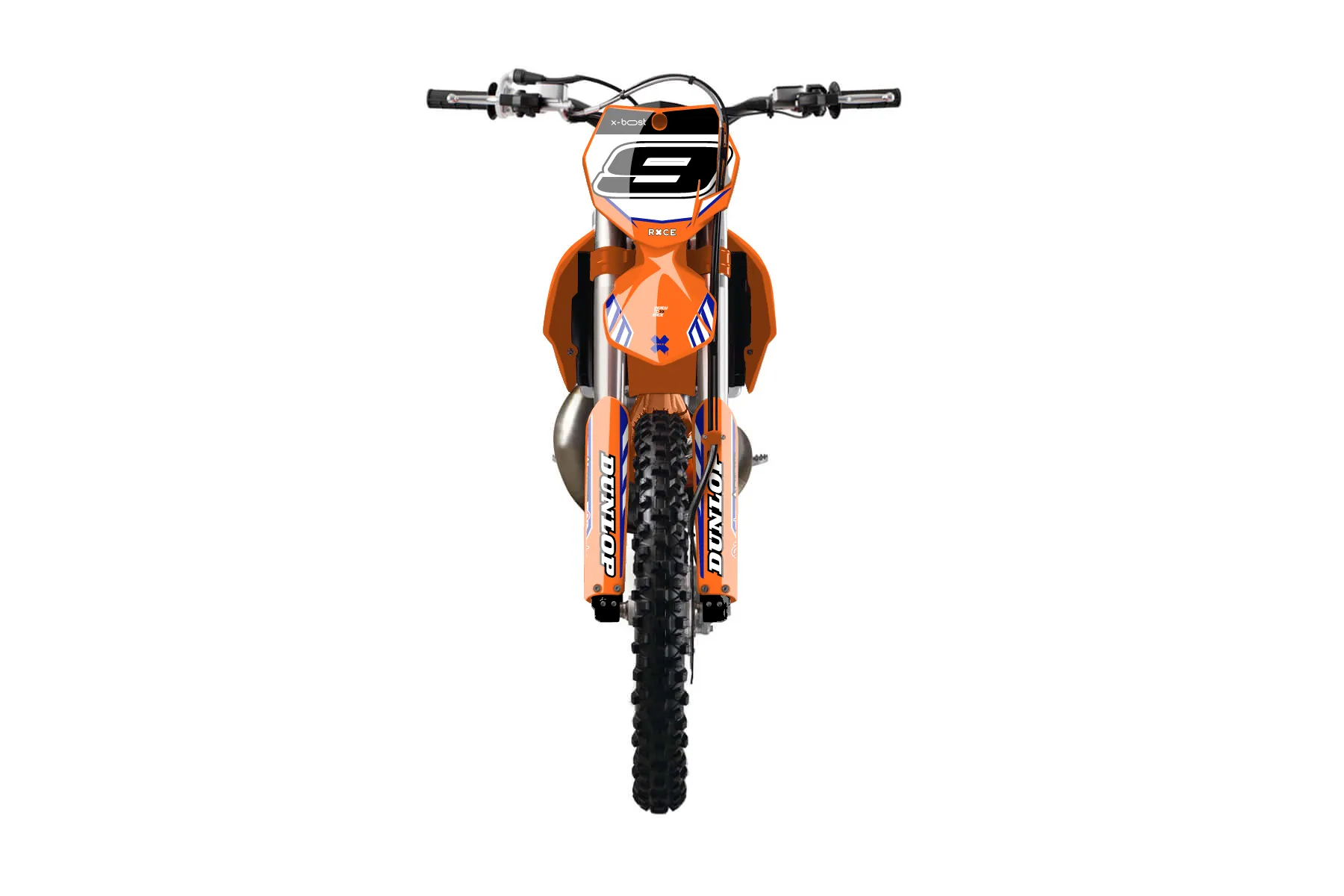 «Showtime» — готовый комплект графики серии Maverick для KTM MX Graphic Kit KTM SX 150 2013. В комплекте: графика на бак и боковые облицовки, крылья (переднее и заднее), передний щиток, номерные таблички, защита вилки. Материал: ПВХ-винил 80 мкр с холодной ламинацией 300 мкр, общая толщина 380 мкр; покрытие глянцевое или матовое на выбор. Устойчив к UV-излучению, воде, бензину и мойке высокого давления. Клей акриловый на сольвентной основе — постоянный, для гибких пластиков. На простых поверхностях монтируется без нагрева; для сложных изгибов рекомендуем фен. Этот пресет можно заказать как есть или взять за основу в конструкторе: поменять цвета, добавить стартовый номер и свой бренд. Производство — 3–5 рабочих дней, доставка по России СДЭКом или Почтой, по СНГ — курьерскими службами.