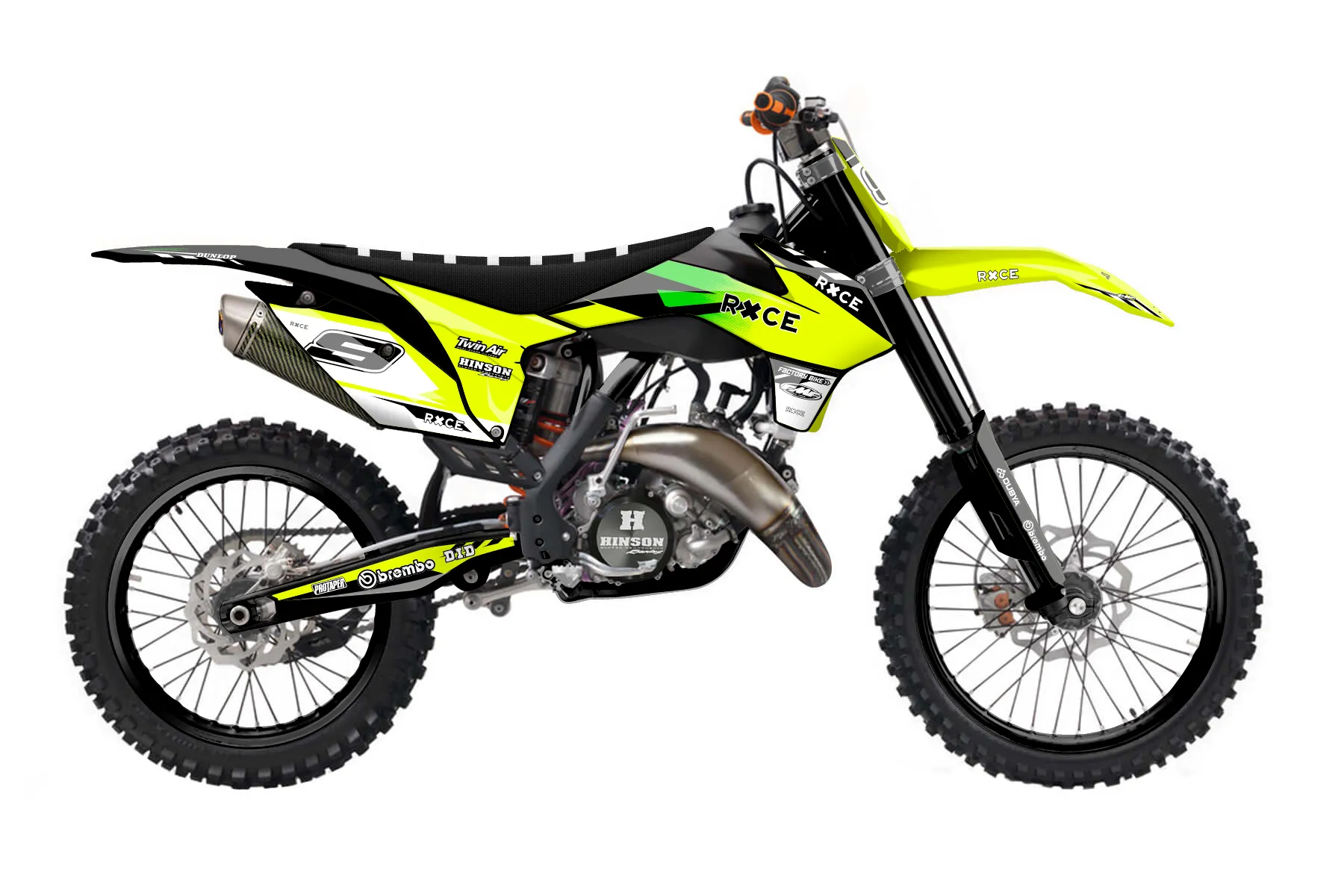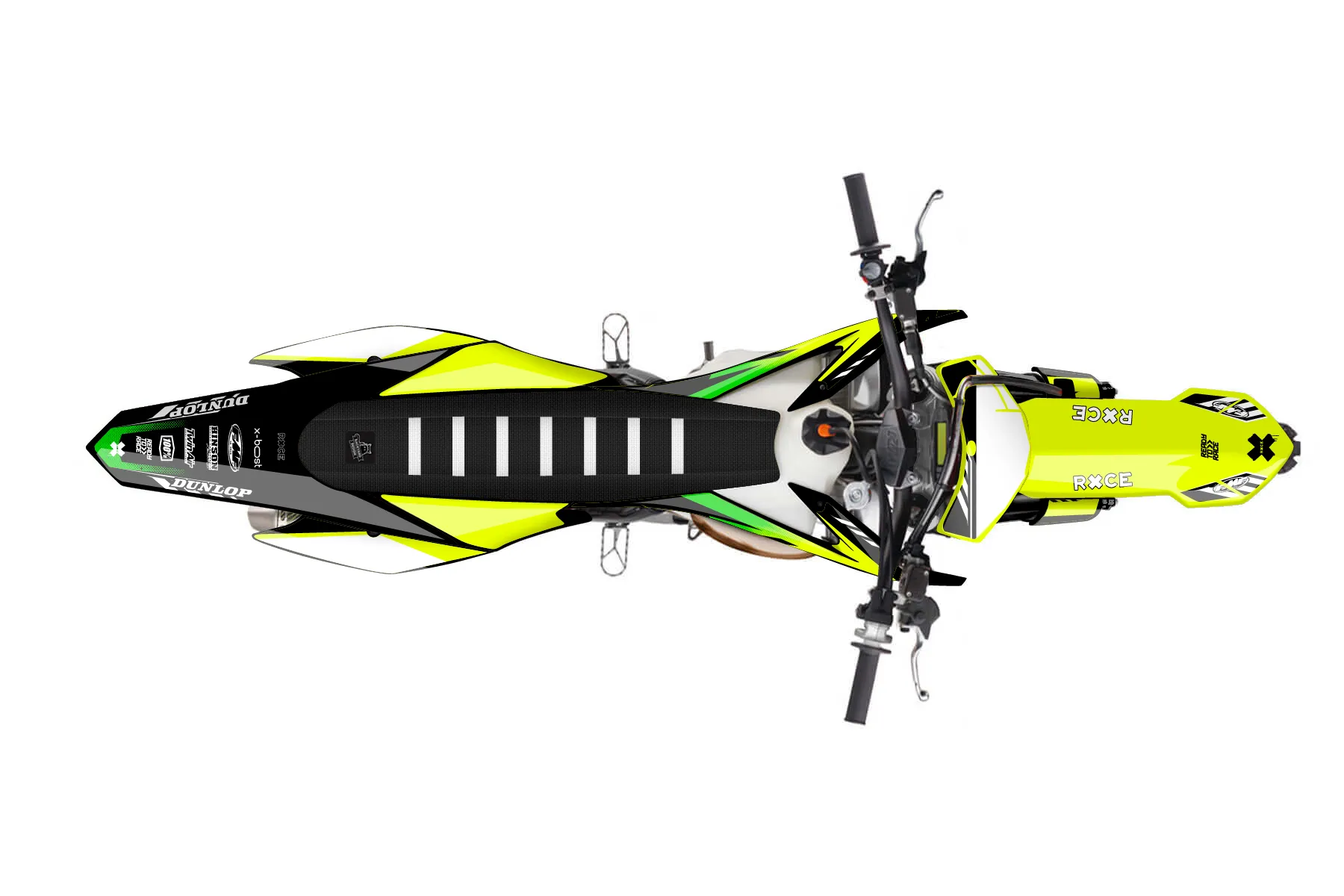 «Volt Neon» — готовый комплект графики серии Maverick для KTM MX Graphic Kit KTM SX 150 2013. В комплекте: графика на бак и боковые облицовки, крылья (переднее и заднее), передний щиток, номерные таблички, защита вилки. Материал: ПВХ-винил 80 мкр с холодной ламинацией 300 мкр, общая толщина 380 мкр; покрытие глянцевое или матовое на выбор. Устойчив к UV-излучению, воде, бензину и мойке высокого давления. Клей акриловый на сольвентной основе — постоянный, для гибких пластиков. На простых поверхностях монтируется без нагрева; для сложных изгибов рекомендуем фен. Этот пресет можно заказать как есть или взять за основу в конструкторе: поменять цвета, добавить стартовый номер и свой бренд. Производство — 3–5 рабочих дней, доставка по России СДЭКом или Почтой, по СНГ — курьерскими службами.