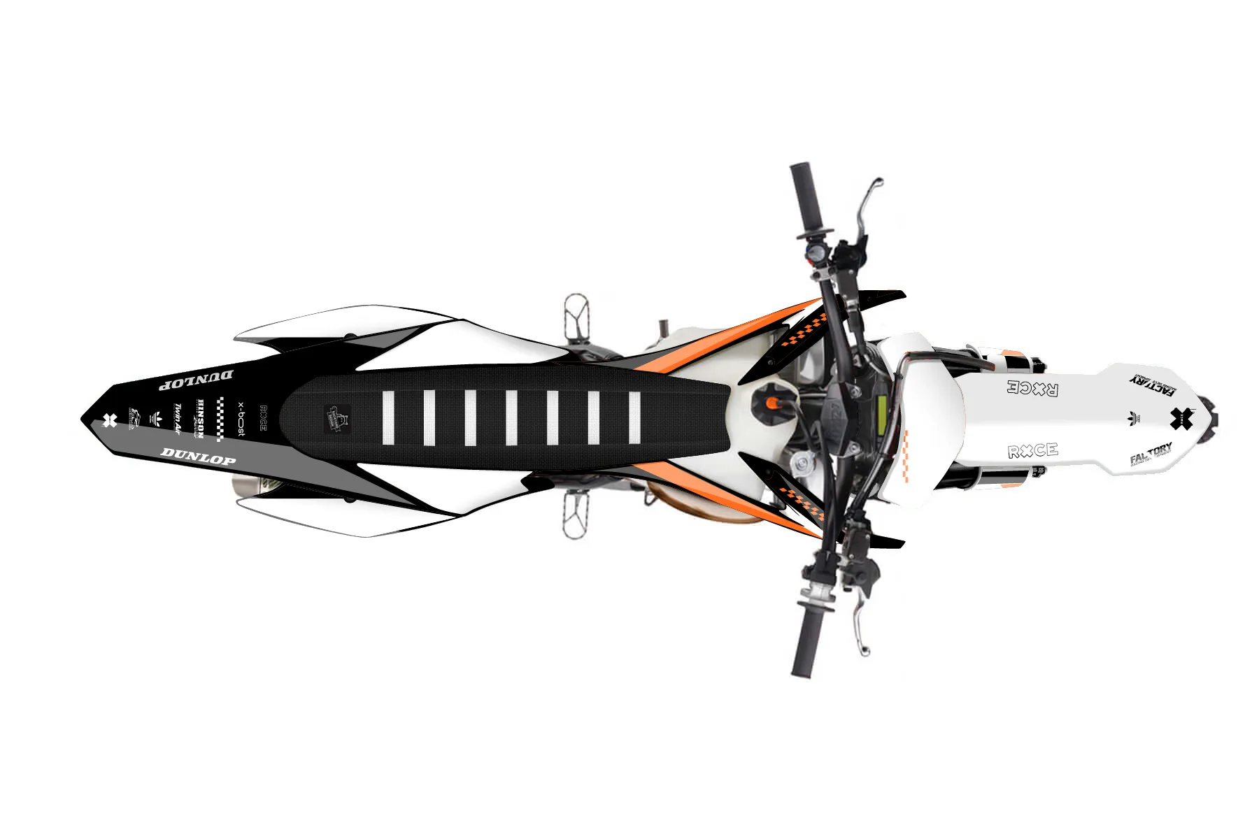 «Covering» — готовый комплект графики серии Staple для KTM MX Graphic Kit KTM SX 150 2013. В комплекте: графика на бак и боковые облицовки, крылья (переднее и заднее), передний щиток, номерные таблички, защита вилки. Материал: ПВХ-винил 80 мкр с холодной ламинацией 300 мкр, общая толщина 380 мкр; покрытие глянцевое или матовое на выбор. Устойчив к UV-излучению, воде, бензину и мойке высокого давления. Клей акриловый на сольвентной основе — постоянный, для гибких пластиков. На простых поверхностях монтируется без нагрева; для сложных изгибов рекомендуем фен. Этот пресет можно заказать как есть или взять за основу в конструкторе: поменять цвета, добавить стартовый номер и свой бренд. Производство — 3–5 рабочих дней, доставка по России СДЭКом или Почтой, по СНГ — курьерскими службами.
