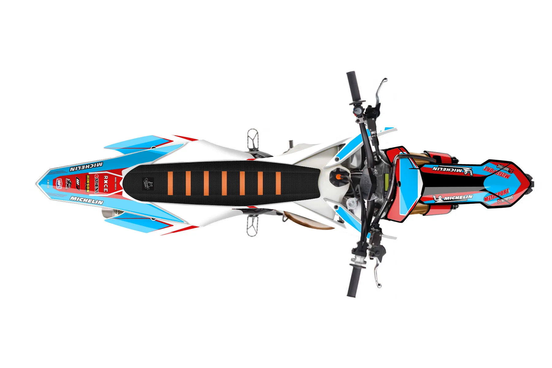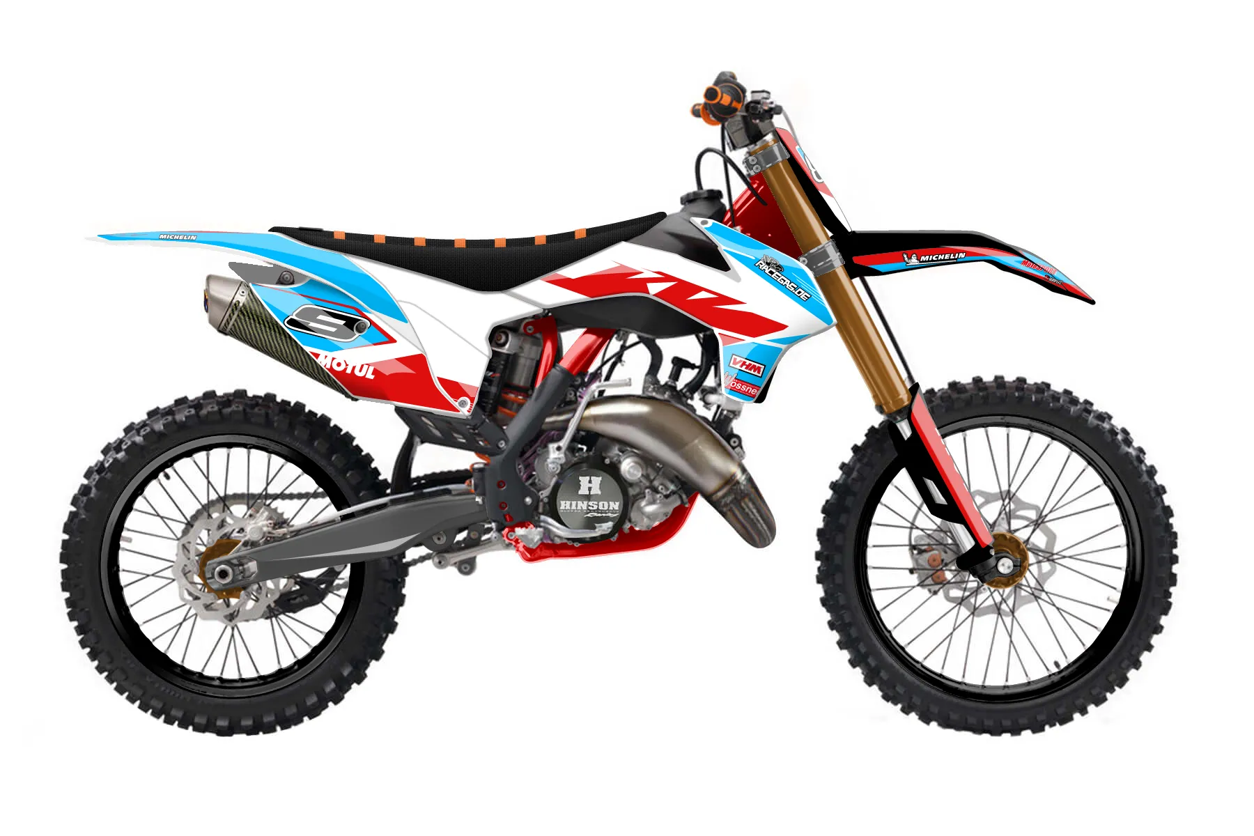«Mk5.2» — готовый комплект графики серии Staple для KTM MX Graphic Kit KTM SX 150 2013. В комплекте: графика на бак и боковые облицовки, крылья (переднее и заднее), передний щиток, номерные таблички, защита вилки. Материал: ПВХ-винил 80 мкр с холодной ламинацией 300 мкр, общая толщина 380 мкр; покрытие глянцевое или матовое на выбор. Устойчив к UV-излучению, воде, бензину и мойке высокого давления. Клей акриловый на сольвентной основе — постоянный, для гибких пластиков. На простых поверхностях монтируется без нагрева; для сложных изгибов рекомендуем фен. Этот пресет можно заказать как есть или взять за основу в конструкторе: поменять цвета, добавить стартовый номер и свой бренд. Производство — 3–5 рабочих дней, доставка по России СДЭКом или Почтой, по СНГ — курьерскими службами.