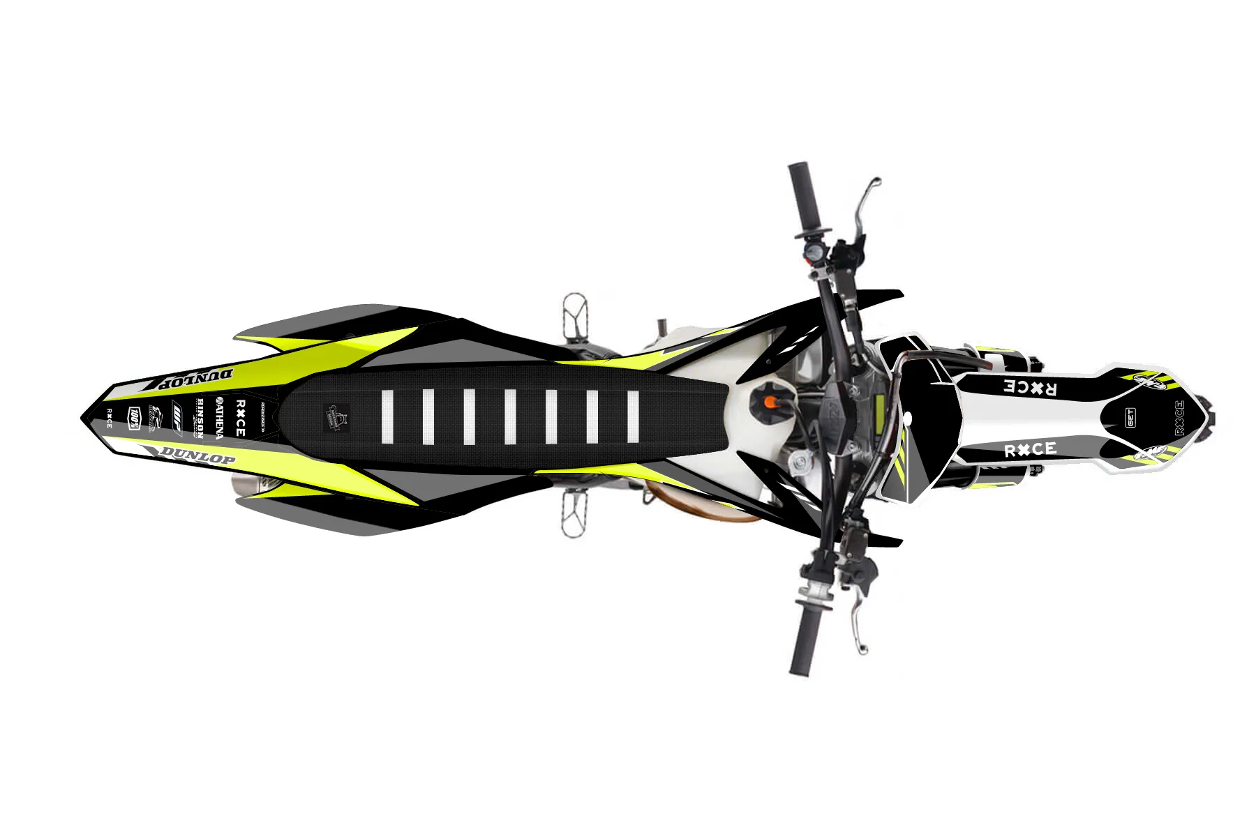 «Daze Fluo» — готовый комплект графики серии Maverick для KTM MX Graphic Kit KTM SX 150 2015. В комплекте: графика на бак и боковые облицовки, крылья (переднее и заднее), передний щиток, номерные таблички, защита вилки. Материал: ПВХ-винил 80 мкр с холодной ламинацией 300 мкр, общая толщина 380 мкр; покрытие глянцевое или матовое на выбор. Устойчив к UV-излучению, воде, бензину и мойке высокого давления. Клей акриловый на сольвентной основе — постоянный, для гибких пластиков. На простых поверхностях монтируется без нагрева; для сложных изгибов рекомендуем фен. Этот пресет можно заказать как есть или взять за основу в конструкторе: поменять цвета, добавить стартовый номер и свой бренд. Производство — 3–5 рабочих дней, доставка по России СДЭКом или Почтой, по СНГ — курьерскими службами.