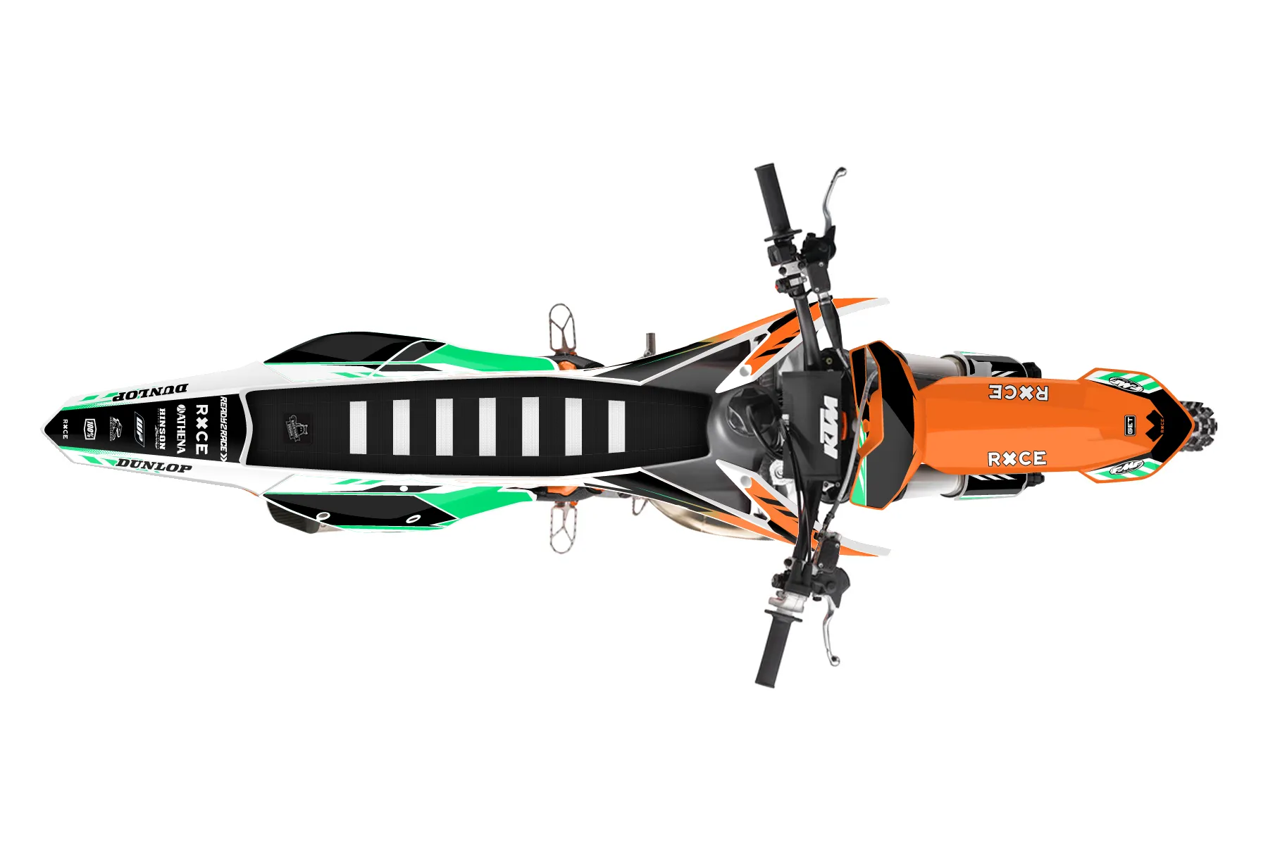 «Future» — готовый комплект графики серии Maverick для KTM MX Graphic Kit KTM SX 150 2016. В комплекте: графика на бак и боковые облицовки, крылья (переднее и заднее), передний щиток, номерные таблички, защита вилки. Материал: ПВХ-винил 80 мкр с холодной ламинацией 300 мкр, общая толщина 380 мкр; покрытие глянцевое или матовое на выбор. Устойчив к UV-излучению, воде, бензину и мойке высокого давления. Клей акриловый на сольвентной основе — постоянный, для гибких пластиков. На простых поверхностях монтируется без нагрева; для сложных изгибов рекомендуем фен. Этот пресет можно заказать как есть или взять за основу в конструкторе: поменять цвета, добавить стартовый номер и свой бренд. Производство — 3–5 рабочих дней, доставка по России СДЭКом или Почтой, по СНГ — курьерскими службами.
