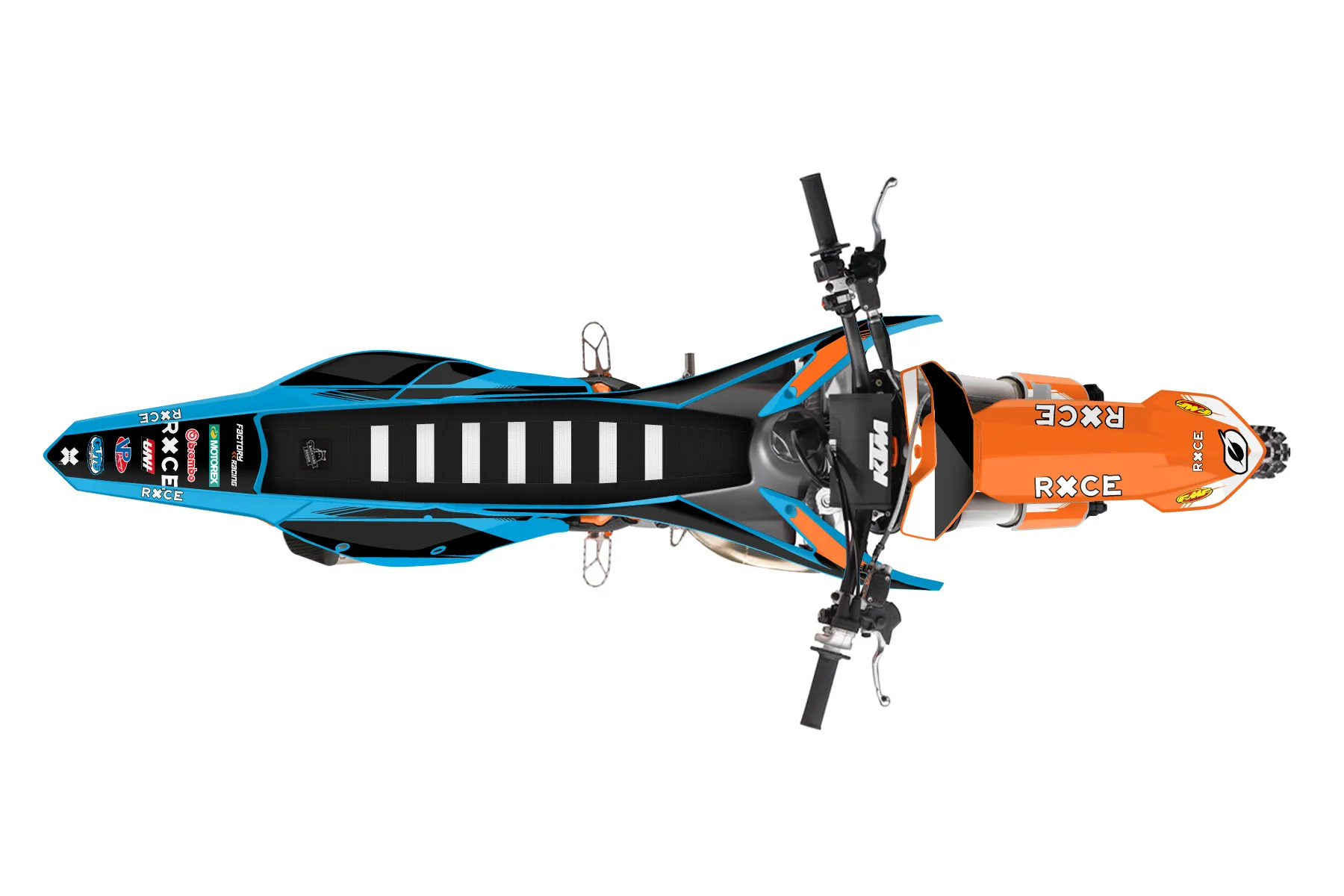 «2025 KTM RIPPER» — готовый комплект графики серии Untucked для KTM MX Graphic Kit KTM SX 150 2016. В комплекте: графика на бак и боковые облицовки, крылья (переднее и заднее), передний щиток, номерные таблички, защита вилки. Материал: ПВХ-винил 80 мкр с холодной ламинацией 300 мкр, общая толщина 380 мкр; покрытие глянцевое или матовое на выбор. Устойчив к UV-излучению, воде, бензину и мойке высокого давления. Клей акриловый на сольвентной основе — постоянный, для гибких пластиков. На простых поверхностях монтируется без нагрева; для сложных изгибов рекомендуем фен. Этот пресет можно заказать как есть или взять за основу в конструкторе: поменять цвета, добавить стартовый номер и свой бренд. Производство — 3–5 рабочих дней, доставка по России СДЭКом или Почтой, по СНГ — курьерскими службами.