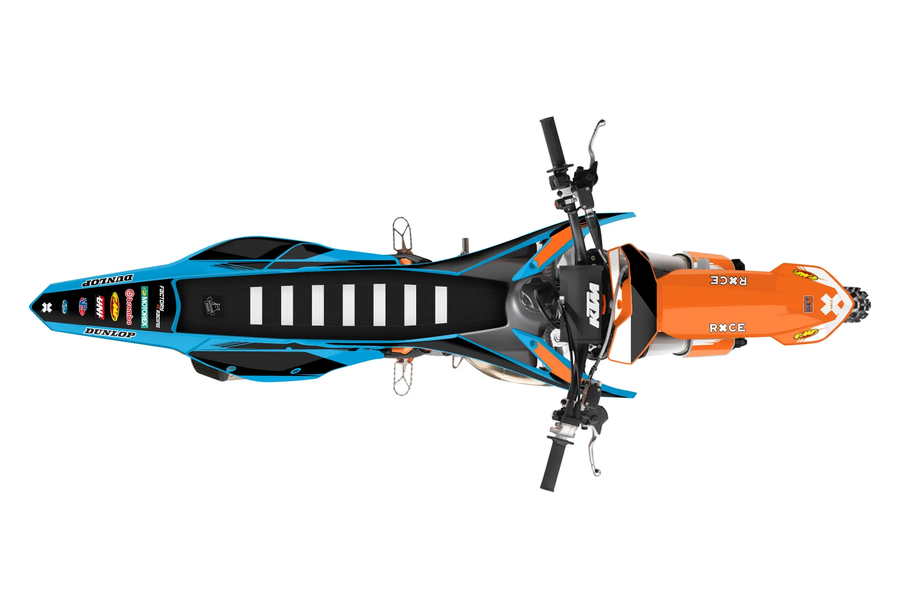 «KTM ripper» — готовый комплект графики серии Untucked для KTM MX Graphic Kit KTM SX 150 2016. В комплекте: графика на бак и боковые облицовки, крылья (переднее и заднее), передний щиток, номерные таблички, защита вилки. Материал: ПВХ-винил 80 мкр с холодной ламинацией 300 мкр, общая толщина 380 мкр; покрытие глянцевое или матовое на выбор. Устойчив к UV-излучению, воде, бензину и мойке высокого давления. Клей акриловый на сольвентной основе — постоянный, для гибких пластиков. На простых поверхностях монтируется без нагрева; для сложных изгибов рекомендуем фен. Этот пресет можно заказать как есть или взять за основу в конструкторе: поменять цвета, добавить стартовый номер и свой бренд. Производство — 3–5 рабочих дней, доставка по России СДЭКом или Почтой, по СНГ — курьерскими службами.