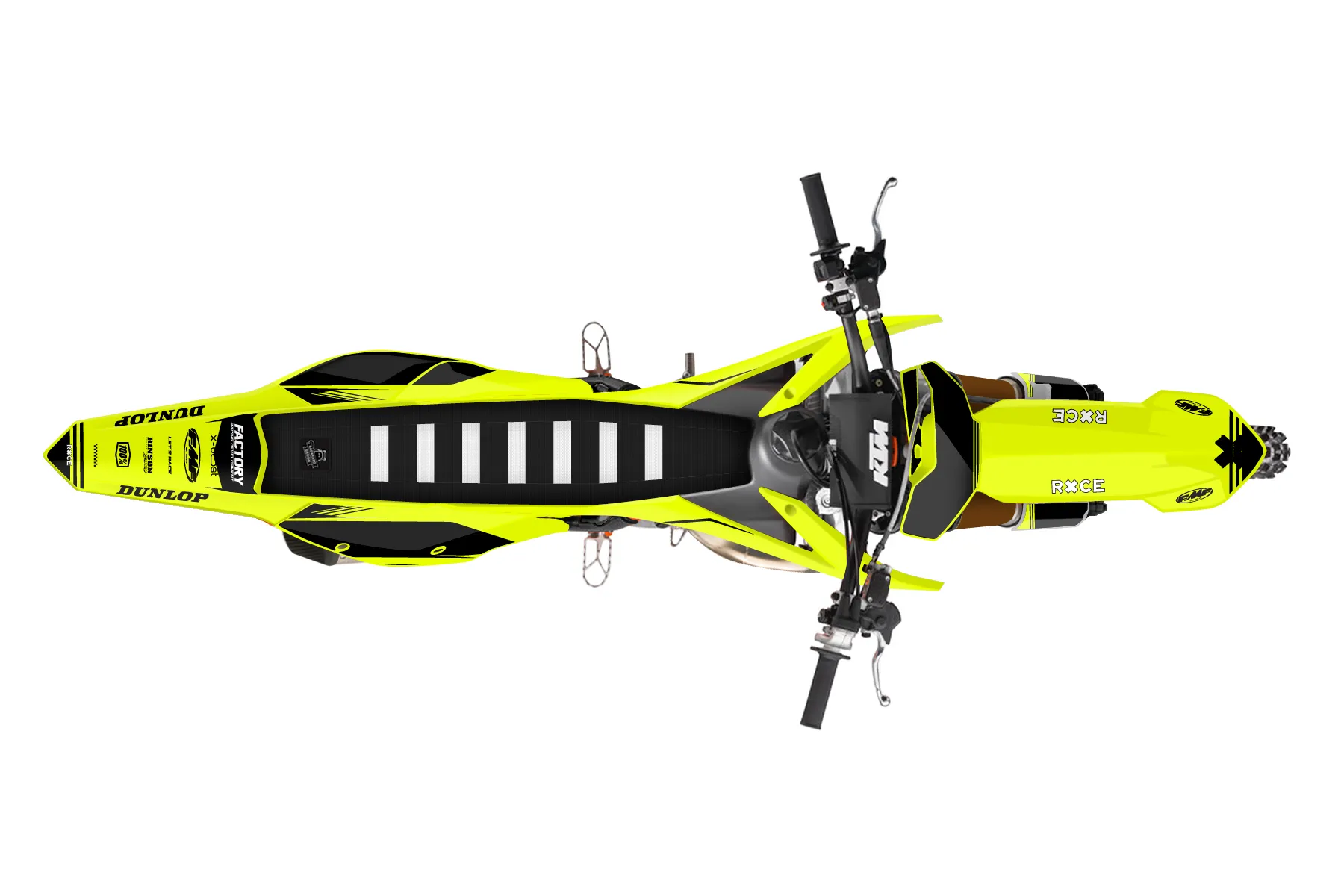 «Loose Neon» — готовый комплект графики серии Untucked для KTM MX Graphic Kit KTM SX 150 2016. В комплекте: графика на бак и боковые облицовки, крылья (переднее и заднее), передний щиток, номерные таблички, защита вилки. Материал: ПВХ-винил 80 мкр с холодной ламинацией 300 мкр, общая толщина 380 мкр; покрытие глянцевое или матовое на выбор. Устойчив к UV-излучению, воде, бензину и мойке высокого давления. Клей акриловый на сольвентной основе — постоянный, для гибких пластиков. На простых поверхностях монтируется без нагрева; для сложных изгибов рекомендуем фен. Этот пресет можно заказать как есть или взять за основу в конструкторе: поменять цвета, добавить стартовый номер и свой бренд. Производство — 3–5 рабочих дней, доставка по России СДЭКом или Почтой, по СНГ — курьерскими службами.