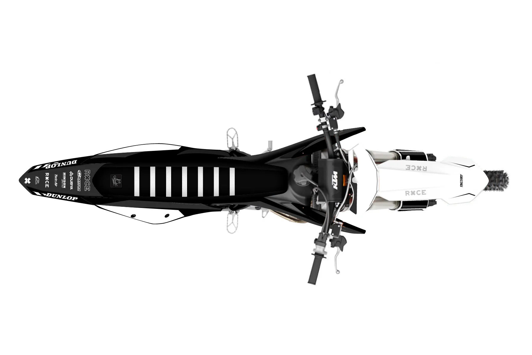 «black+white» — готовый комплект графики серии Maverick для KTM MX Graphic Kit KTM SX 150 2019. В комплекте: графика на бак и боковые облицовки, крылья (переднее и заднее), передний щиток, номерные таблички, защита вилки. Материал: ПВХ-винил 80 мкр с холодной ламинацией 300 мкр, общая толщина 380 мкр; покрытие глянцевое или матовое на выбор. Устойчив к UV-излучению, воде, бензину и мойке высокого давления. Клей акриловый на сольвентной основе — постоянный, для гибких пластиков. На простых поверхностях монтируется без нагрева; для сложных изгибов рекомендуем фен. Этот пресет можно заказать как есть или взять за основу в конструкторе: поменять цвета, добавить стартовый номер и свой бренд. Производство — 3–5 рабочих дней, доставка по России СДЭКом или Почтой, по СНГ — курьерскими службами.