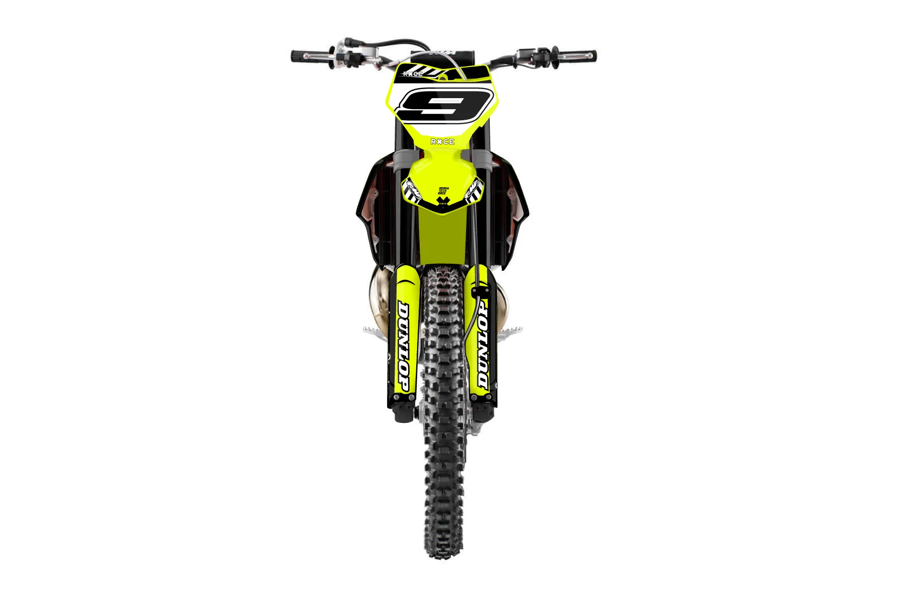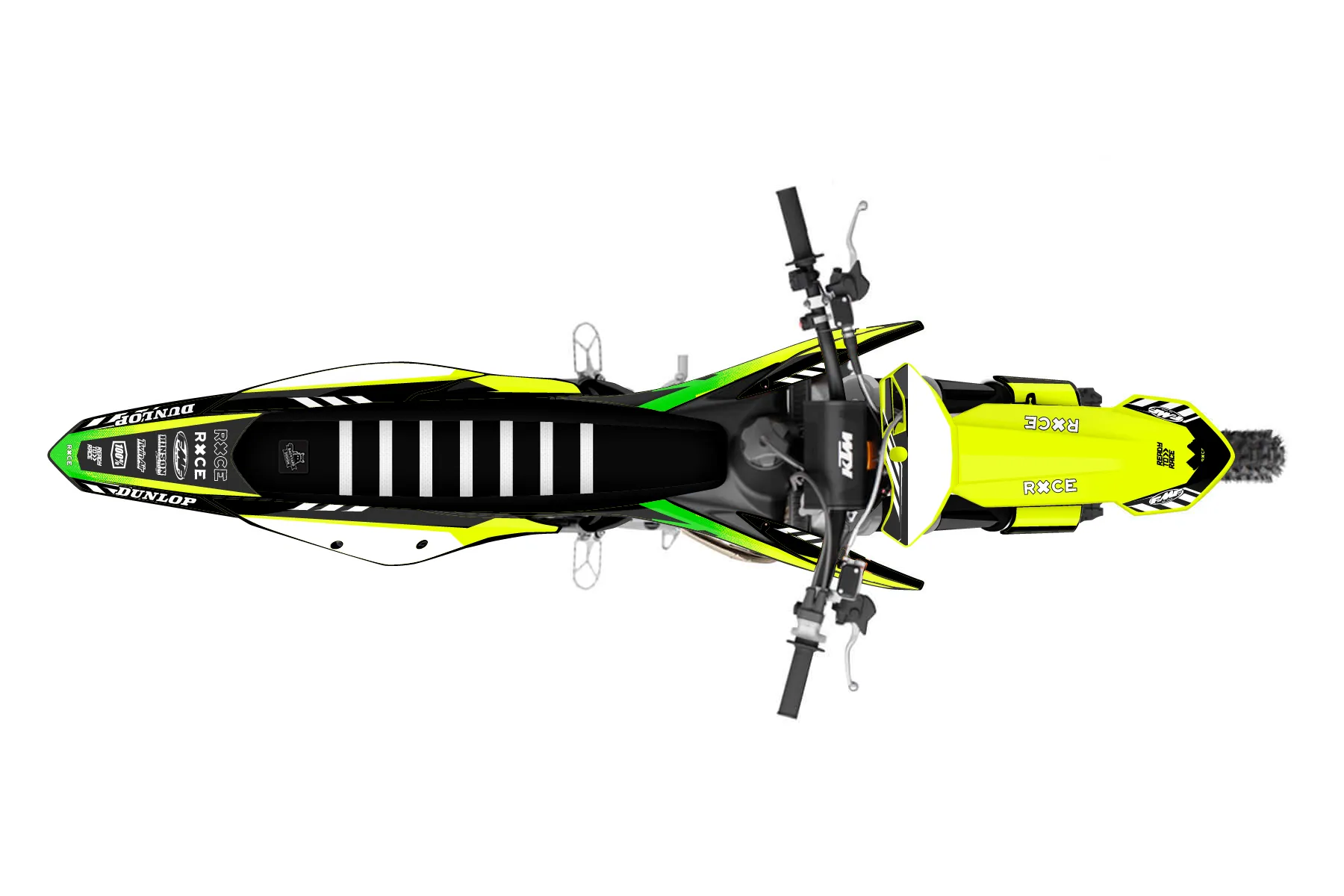 «Volt Neon» — готовый комплект графики серии Maverick для KTM MX Graphic Kit KTM SX 150 2019. В комплекте: графика на бак и боковые облицовки, крылья (переднее и заднее), передний щиток, номерные таблички, защита вилки. Материал: ПВХ-винил 80 мкр с холодной ламинацией 300 мкр, общая толщина 380 мкр; покрытие глянцевое или матовое на выбор. Устойчив к UV-излучению, воде, бензину и мойке высокого давления. Клей акриловый на сольвентной основе — постоянный, для гибких пластиков. На простых поверхностях монтируется без нагрева; для сложных изгибов рекомендуем фен. Этот пресет можно заказать как есть или взять за основу в конструкторе: поменять цвета, добавить стартовый номер и свой бренд. Производство — 3–5 рабочих дней, доставка по России СДЭКом или Почтой, по СНГ — курьерскими службами.