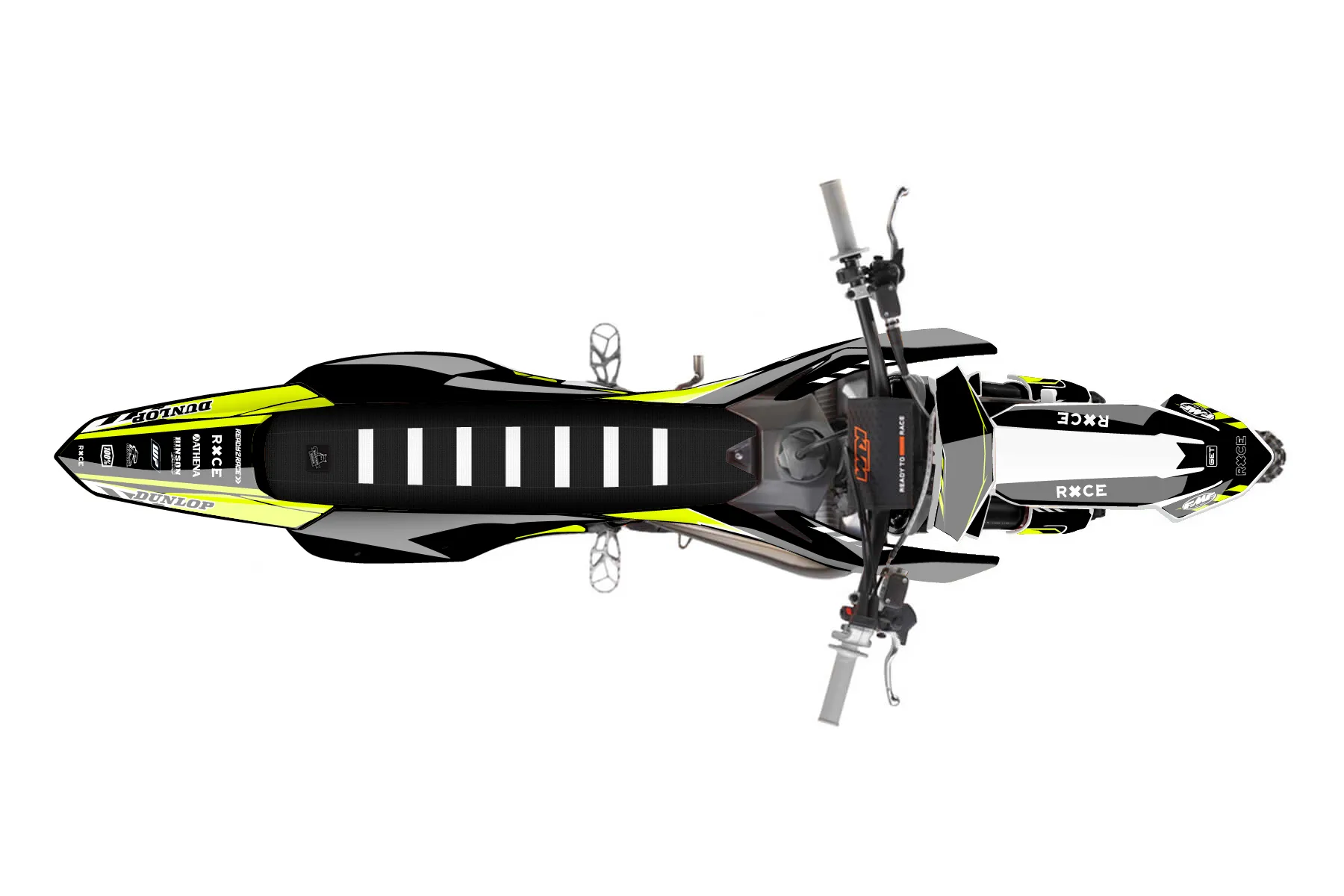 «Daze Fluo» — готовый комплект графики серии Maverick для KTM MX Graphic Kit KTM SX 150 2023. В комплекте: графика на бак и боковые облицовки, крылья (переднее и заднее), передний щиток, номерные таблички, защита вилки. Материал: ПВХ-винил 80 мкр с холодной ламинацией 300 мкр, общая толщина 380 мкр; покрытие глянцевое или матовое на выбор. Устойчив к UV-излучению, воде, бензину и мойке высокого давления. Клей акриловый на сольвентной основе — постоянный, для гибких пластиков. На простых поверхностях монтируется без нагрева; для сложных изгибов рекомендуем фен. Этот пресет можно заказать как есть или взять за основу в конструкторе: поменять цвета, добавить стартовый номер и свой бренд. Производство — 3–5 рабочих дней, доставка по России СДЭКом или Почтой, по СНГ — курьерскими службами.