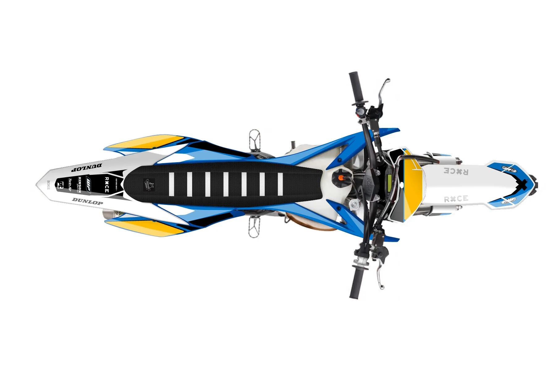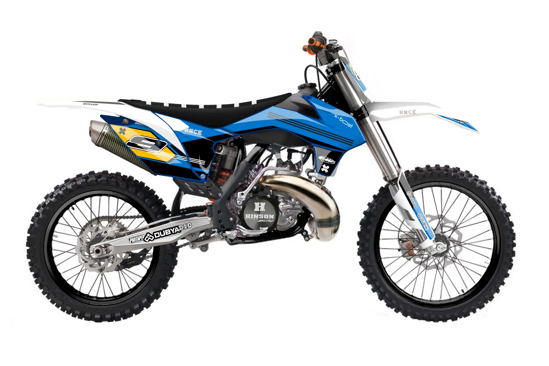 «All-Star» — готовый комплект графики серии Flow для KTM MX Graphic Kit KTM SX 250 2013. В комплекте: графика на бак и боковые облицовки, крылья (переднее и заднее), передний щиток, номерные таблички, защита вилки. Материал: ПВХ-винил 80 мкр с холодной ламинацией 300 мкр, общая толщина 380 мкр; покрытие глянцевое или матовое на выбор. Устойчив к UV-излучению, воде, бензину и мойке высокого давления. Клей акриловый на сольвентной основе — постоянный, для гибких пластиков. На простых поверхностях монтируется без нагрева; для сложных изгибов рекомендуем фен. Этот пресет можно заказать как есть или взять за основу в конструкторе: поменять цвета, добавить стартовый номер и свой бренд. Производство — 3–5 рабочих дней, доставка по России СДЭКом или Почтой, по СНГ — курьерскими службами.
