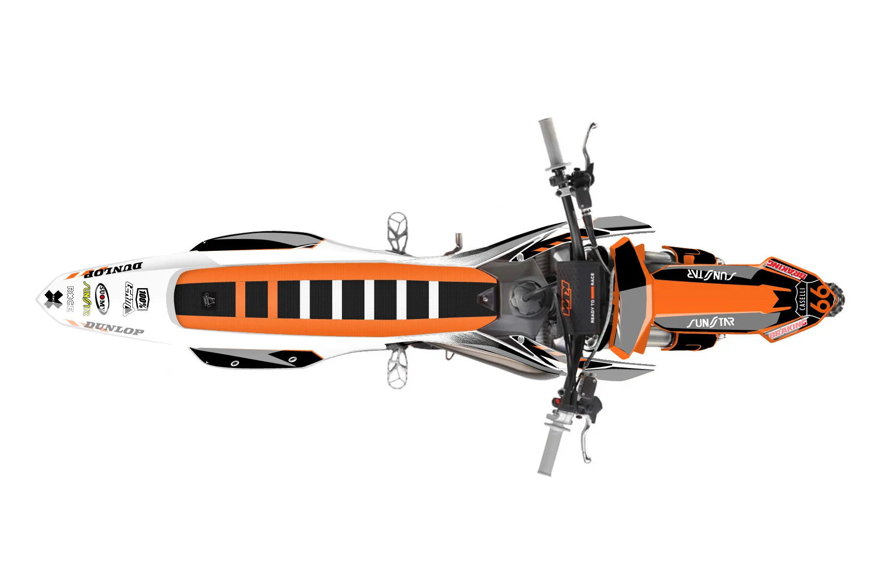 «TSR 2025» — готовый комплект графики серии Maverick для KTM MX Graphic Kit KTM SX 250 2023. В комплекте: графика на бак и боковые облицовки, крылья (переднее и заднее), передний щиток, номерные таблички, защита вилки. Материал: ПВХ-винил 80 мкр с холодной ламинацией 300 мкр, общая толщина 380 мкр; покрытие глянцевое или матовое на выбор. Устойчив к UV-излучению, воде, бензину и мойке высокого давления. Клей акриловый на сольвентной основе — постоянный, для гибких пластиков. На простых поверхностях монтируется без нагрева; для сложных изгибов рекомендуем фен. Этот пресет можно заказать как есть или взять за основу в конструкторе: поменять цвета, добавить стартовый номер и свой бренд. Производство — 3–5 рабочих дней, доставка по России СДЭКом или Почтой, по СНГ — курьерскими службами.