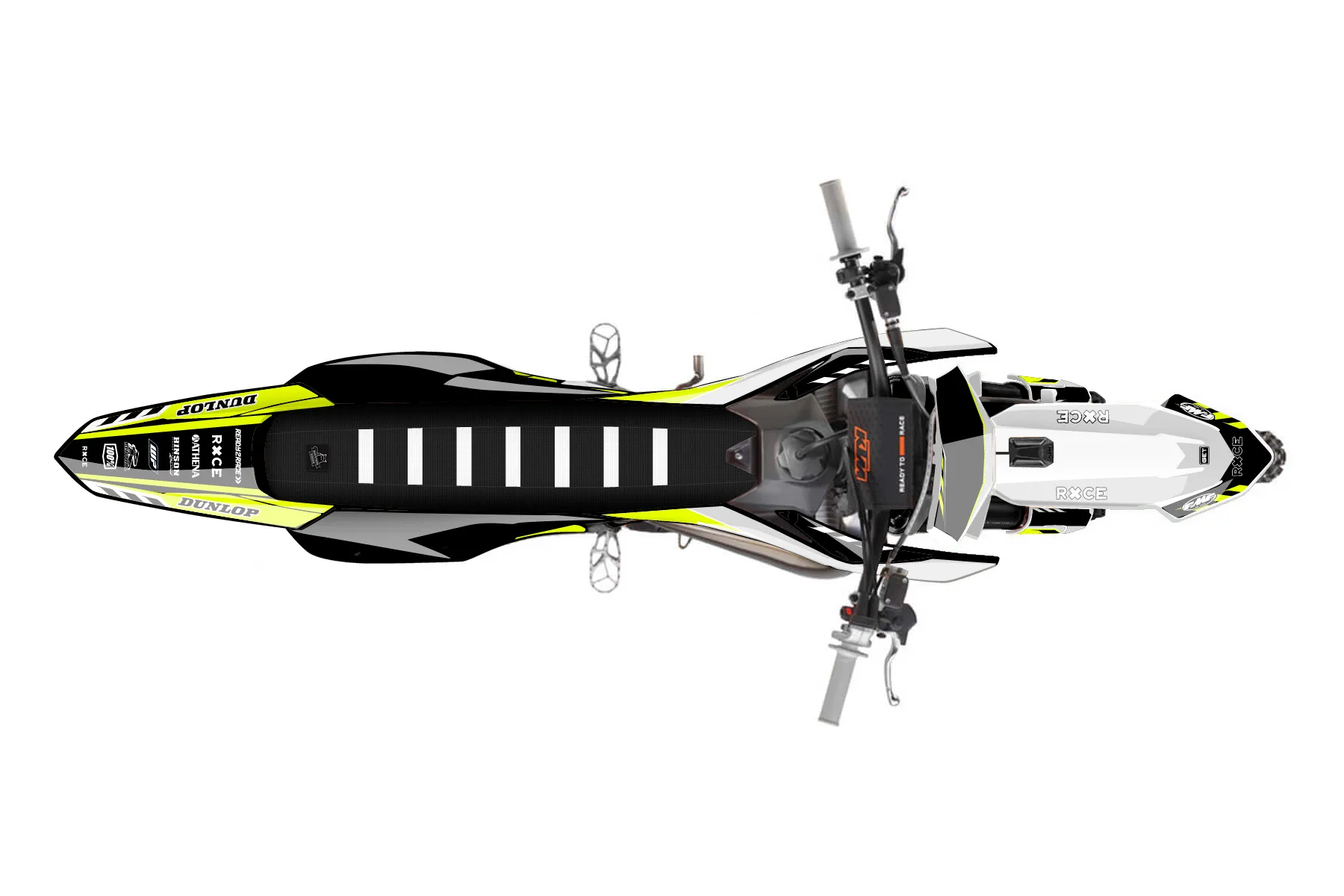 «Daze Fluo» — готовый комплект графики серии Maverick для KTM MX Graphic Kit KTM SX 300 2026. В комплекте: графика на бак и боковые облицовки, крылья (переднее и заднее), передний щиток, номерные таблички, защита вилки. Материал: ПВХ-винил 80 мкр с холодной ламинацией 300 мкр, общая толщина 380 мкр; покрытие глянцевое или матовое на выбор. Устойчив к UV-излучению, воде, бензину и мойке высокого давления. Клей акриловый на сольвентной основе — постоянный, для гибких пластиков. На простых поверхностях монтируется без нагрева; для сложных изгибов рекомендуем фен. Этот пресет можно заказать как есть или взять за основу в конструкторе: поменять цвета, добавить стартовый номер и свой бренд. Производство — 3–5 рабочих дней, доставка по России СДЭКом или Почтой, по СНГ — курьерскими службами.