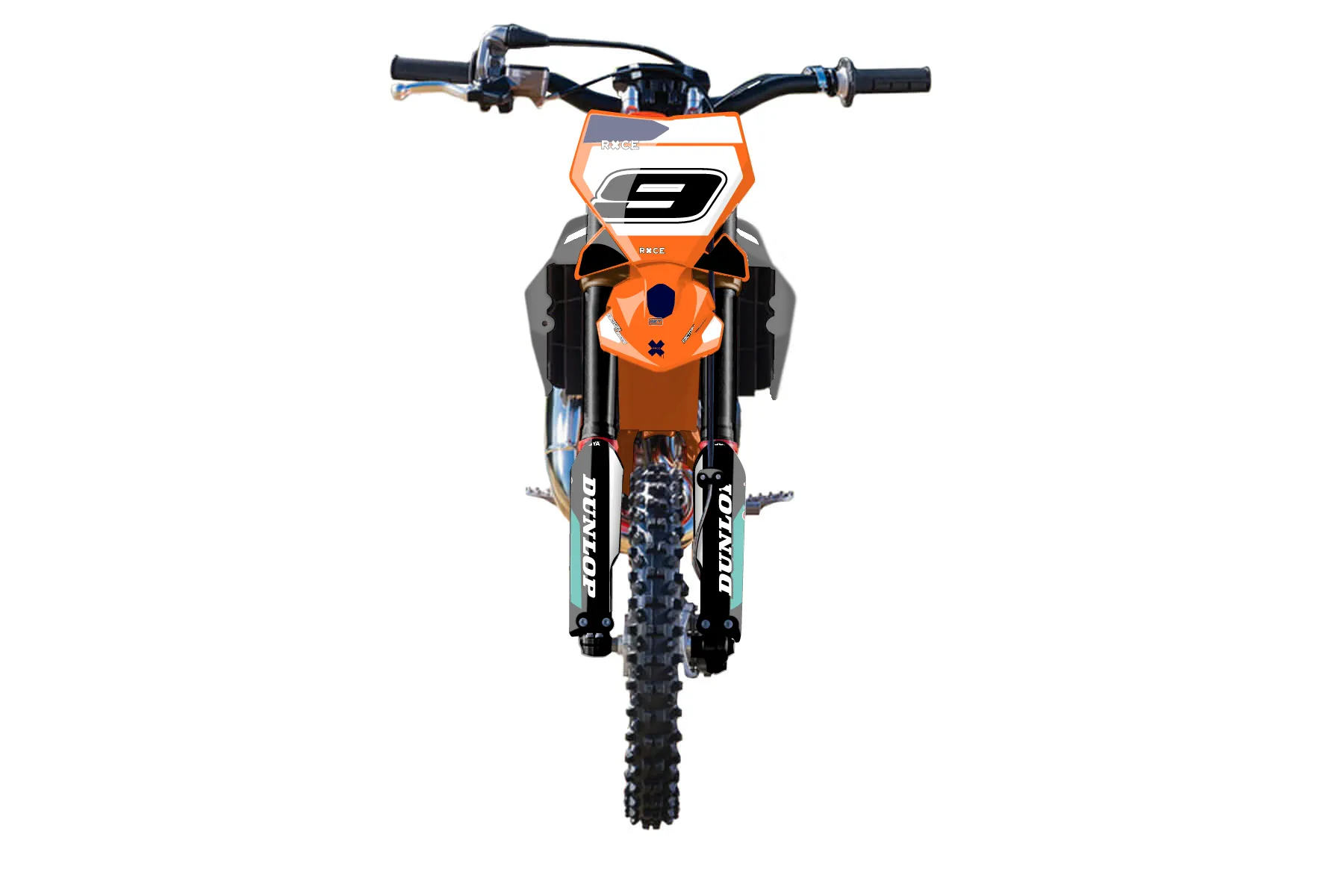 «Thrive» — готовый комплект графики серии Flow для KTM MX Graphic Kit KTM SX 50 2009. В комплекте: графика на бак и боковые облицовки, крылья (переднее и заднее), передний щиток, номерные таблички, защита вилки. Материал: ПВХ-винил 80 мкр с холодной ламинацией 300 мкр, общая толщина 380 мкр; покрытие глянцевое или матовое на выбор. Устойчив к UV-излучению, воде, бензину и мойке высокого давления. Клей акриловый на сольвентной основе — постоянный, для гибких пластиков. На простых поверхностях монтируется без нагрева; для сложных изгибов рекомендуем фен. Этот пресет можно заказать как есть или взять за основу в конструкторе: поменять цвета, добавить стартовый номер и свой бренд. Производство — 3–5 рабочих дней, доставка по России СДЭКом или Почтой, по СНГ — курьерскими службами.