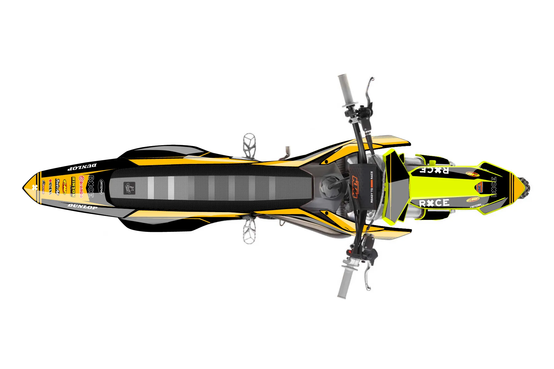 «Cam’s bike» — готовый комплект графики серии Untucked для KTM MX Graphic Kit KTM SX 50 2016. В комплекте: графика на бак и боковые облицовки, крылья (переднее и заднее), передний щиток, номерные таблички, защита вилки. Материал: ПВХ-винил 80 мкр с холодной ламинацией 300 мкр, общая толщина 380 мкр; покрытие глянцевое или матовое на выбор. Устойчив к UV-излучению, воде, бензину и мойке высокого давления. Клей акриловый на сольвентной основе — постоянный, для гибких пластиков. На простых поверхностях монтируется без нагрева; для сложных изгибов рекомендуем фен. Этот пресет можно заказать как есть или взять за основу в конструкторе: поменять цвета, добавить стартовый номер и свой бренд. Производство — 3–5 рабочих дней, доставка по России СДЭКом или Почтой, по СНГ — курьерскими службами.