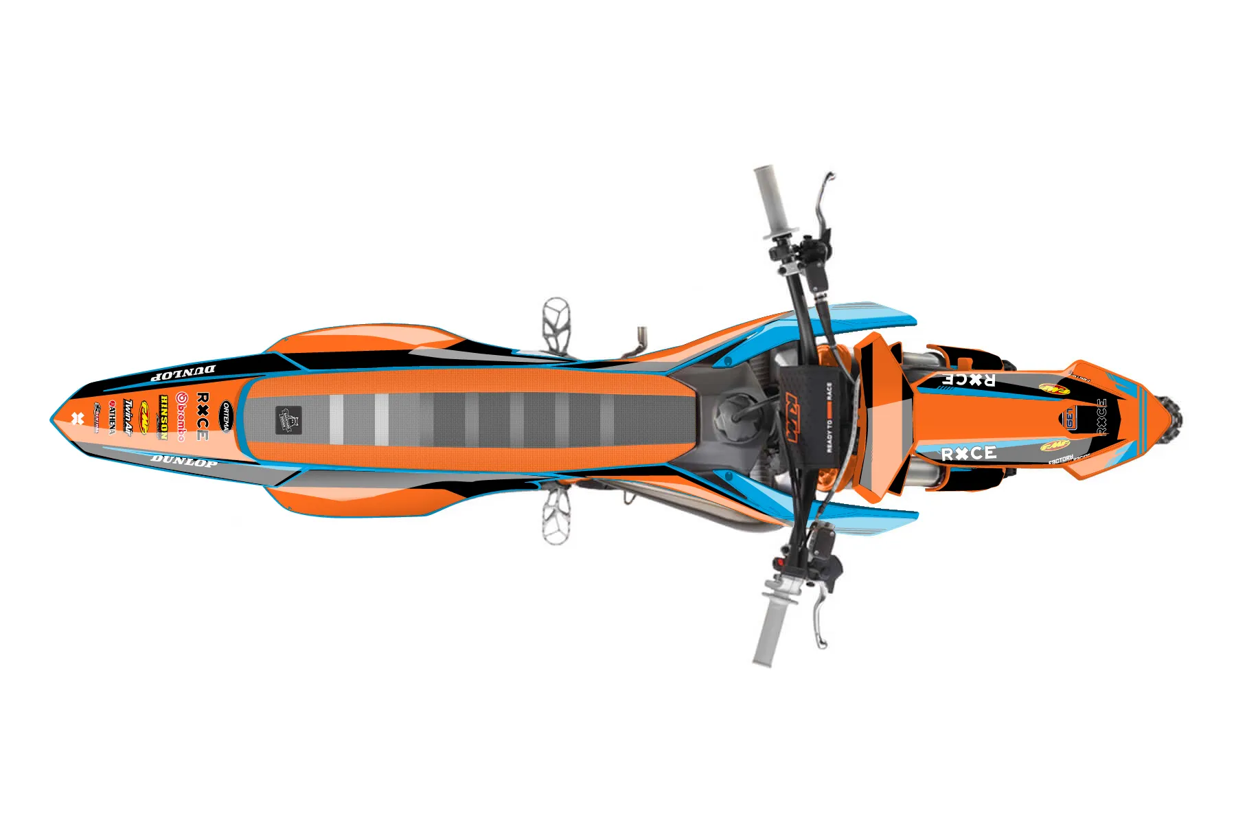 «Light blue Camo & Orange» — готовый комплект графики серии Untucked для KTM MX Graphic Kit KTM SX 50 2016. В комплекте: графика на бак и боковые облицовки, крылья (переднее и заднее), передний щиток, номерные таблички, защита вилки. Материал: ПВХ-винил 80 мкр с холодной ламинацией 300 мкр, общая толщина 380 мкр; покрытие глянцевое или матовое на выбор. Устойчив к UV-излучению, воде, бензину и мойке высокого давления. Клей акриловый на сольвентной основе — постоянный, для гибких пластиков. На простых поверхностях монтируется без нагрева; для сложных изгибов рекомендуем фен. Этот пресет можно заказать как есть или взять за основу в конструкторе: поменять цвета, добавить стартовый номер и свой бренд. Производство — 3–5 рабочих дней, доставка по России СДЭКом или Почтой, по СНГ — курьерскими службами.