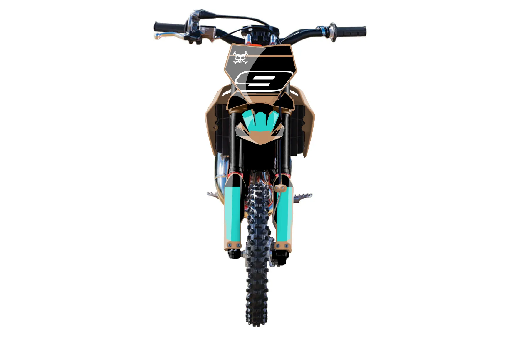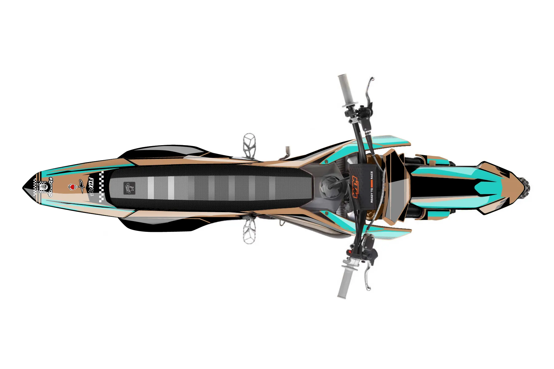 «CustomDesign3/7» — готовый комплект графики серии Untucked для KTM MX Graphic Kit KTM SX 50 2020. В комплекте: графика на бак и боковые облицовки, крылья (переднее и заднее), передний щиток, номерные таблички, защита вилки. Материал: ПВХ-винил 80 мкр с холодной ламинацией 300 мкр, общая толщина 380 мкр; покрытие глянцевое или матовое на выбор. Устойчив к UV-излучению, воде, бензину и мойке высокого давления. Клей акриловый на сольвентной основе — постоянный, для гибких пластиков. На простых поверхностях монтируется без нагрева; для сложных изгибов рекомендуем фен. Этот пресет можно заказать как есть или взять за основу в конструкторе: поменять цвета, добавить стартовый номер и свой бренд. Производство — 3–5 рабочих дней, доставка по России СДЭКом или Почтой, по СНГ — курьерскими службами.