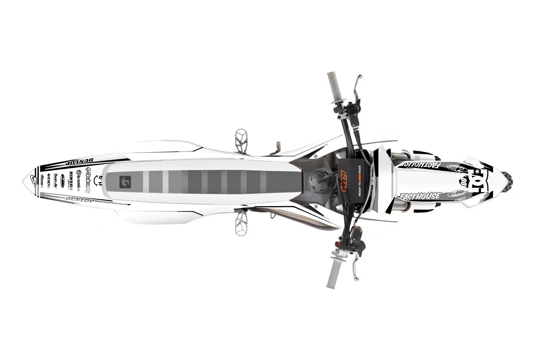 «fast house 1» — готовый комплект графики серии Untucked для KTM MX Graphic Kit KTM SX 50 2020. В комплекте: графика на бак и боковые облицовки, крылья (переднее и заднее), передний щиток, номерные таблички, защита вилки. Материал: ПВХ-винил 80 мкр с холодной ламинацией 300 мкр, общая толщина 380 мкр; покрытие глянцевое или матовое на выбор. Устойчив к UV-излучению, воде, бензину и мойке высокого давления. Клей акриловый на сольвентной основе — постоянный, для гибких пластиков. На простых поверхностях монтируется без нагрева; для сложных изгибов рекомендуем фен. Этот пресет можно заказать как есть или взять за основу в конструкторе: поменять цвета, добавить стартовый номер и свой бренд. Производство — 3–5 рабочих дней, доставка по России СДЭКом или Почтой, по СНГ — курьерскими службами.