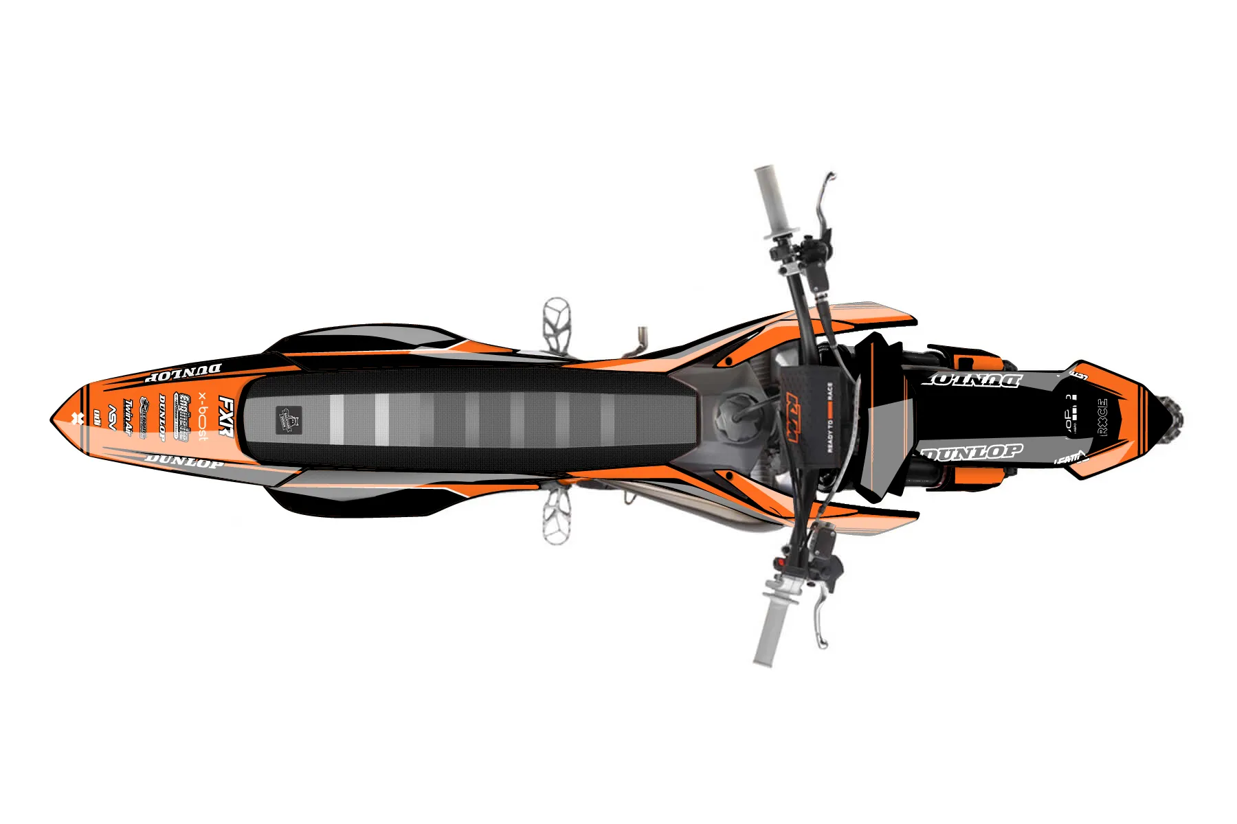 «KTM E5» — готовый комплект графики серии Untucked для KTM MX Graphic Kit KTM SX 50 2020. В комплекте: графика на бак и боковые облицовки, крылья (переднее и заднее), передний щиток, номерные таблички, защита вилки. Материал: ПВХ-винил 80 мкр с холодной ламинацией 300 мкр, общая толщина 380 мкр; покрытие глянцевое или матовое на выбор. Устойчив к UV-излучению, воде, бензину и мойке высокого давления. Клей акриловый на сольвентной основе — постоянный, для гибких пластиков. На простых поверхностях монтируется без нагрева; для сложных изгибов рекомендуем фен. Этот пресет можно заказать как есть или взять за основу в конструкторе: поменять цвета, добавить стартовый номер и свой бренд. Производство — 3–5 рабочих дней, доставка по России СДЭКом или Почтой, по СНГ — курьерскими службами.