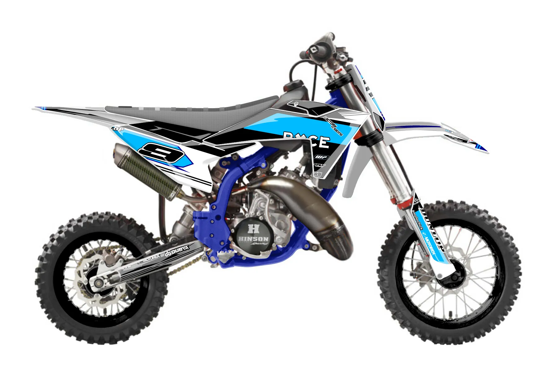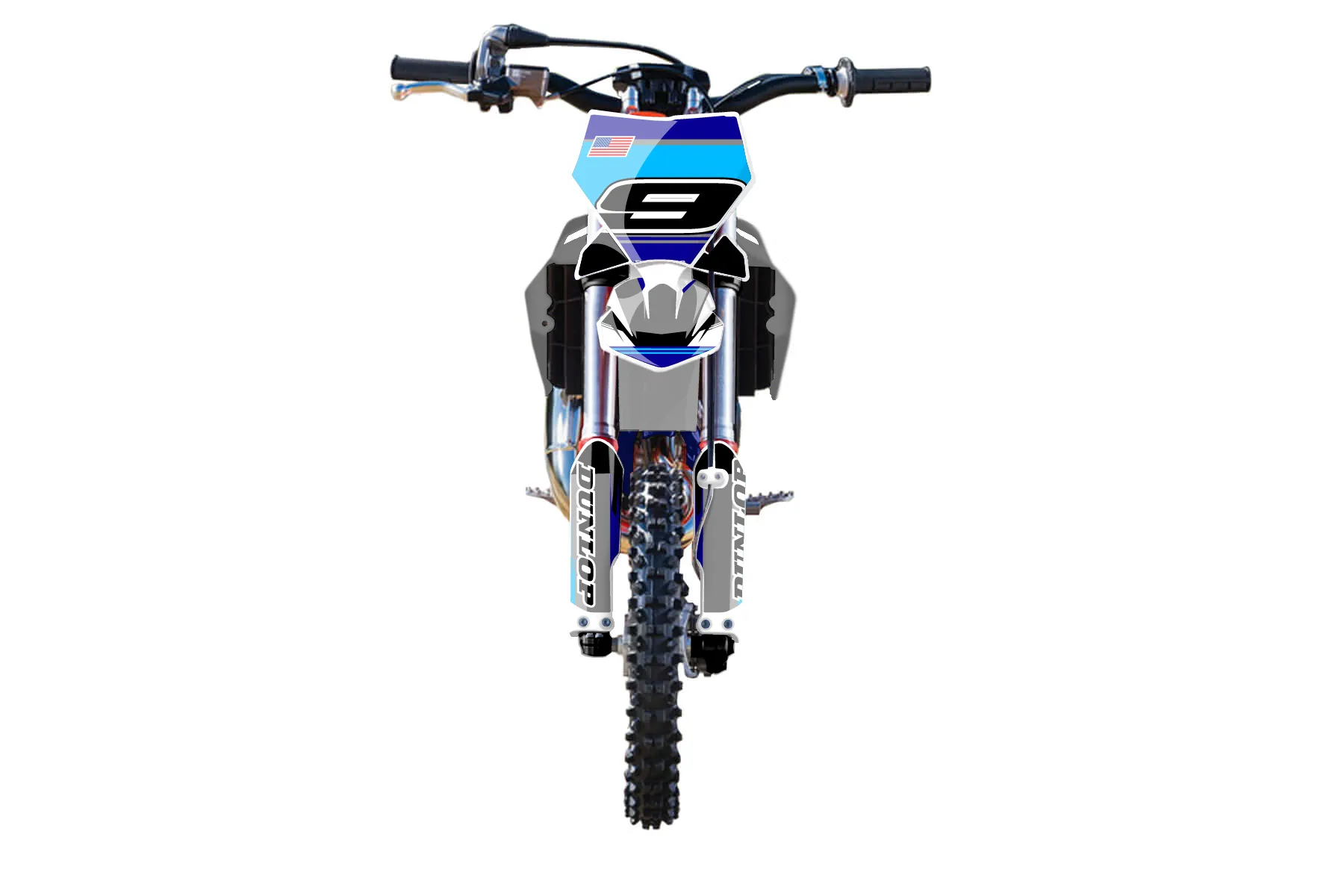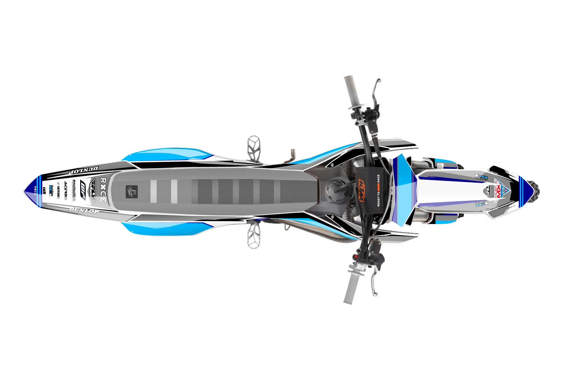 «KTMBlue» — готовый комплект графики серии Untucked для KTM MX Graphic Kit KTM SX 50 2020. В комплекте: графика на бак и боковые облицовки, крылья (переднее и заднее), передний щиток, номерные таблички, защита вилки. Материал: ПВХ-винил 80 мкр с холодной ламинацией 300 мкр, общая толщина 380 мкр; покрытие глянцевое или матовое на выбор. Устойчив к UV-излучению, воде, бензину и мойке высокого давления. Клей акриловый на сольвентной основе — постоянный, для гибких пластиков. На простых поверхностях монтируется без нагрева; для сложных изгибов рекомендуем фен. Этот пресет можно заказать как есть или взять за основу в конструкторе: поменять цвета, добавить стартовый номер и свой бренд. Производство — 3–5 рабочих дней, доставка по России СДЭКом или Почтой, по СНГ — курьерскими службами.