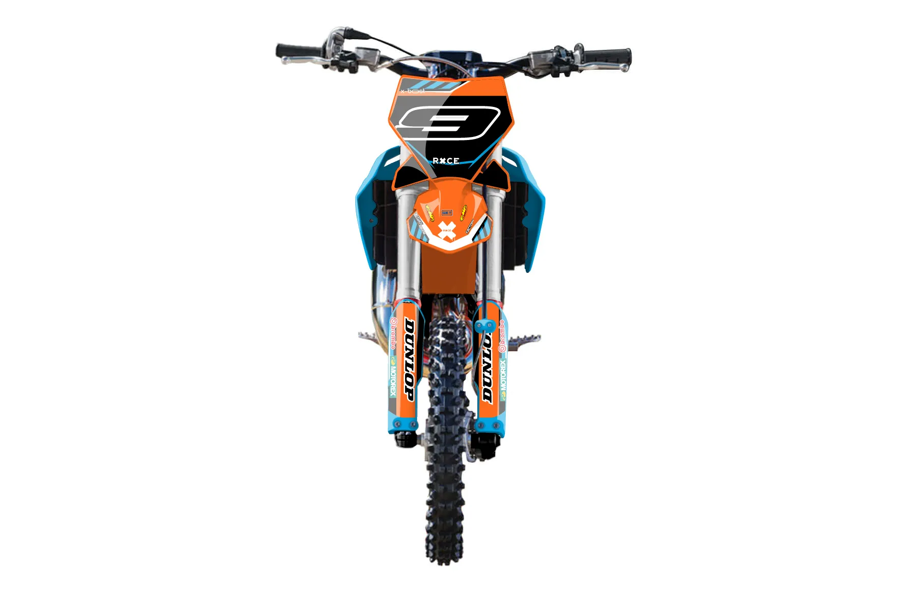 «Bubas design 1» — готовый комплект графики серии Maverick для KTM MX Graphic Kit KTM SX 65 2016. В комплекте: графика на бак и боковые облицовки, крылья (переднее и заднее), передний щиток, номерные таблички, защита вилки. Материал: ПВХ-винил 80 мкр с холодной ламинацией 300 мкр, общая толщина 380 мкр; покрытие глянцевое или матовое на выбор. Устойчив к UV-излучению, воде, бензину и мойке высокого давления. Клей акриловый на сольвентной основе — постоянный, для гибких пластиков. На простых поверхностях монтируется без нагрева; для сложных изгибов рекомендуем фен. Этот пресет можно заказать как есть или взять за основу в конструкторе: поменять цвета, добавить стартовый номер и свой бренд. Производство — 3–5 рабочих дней, доставка по России СДЭКом или Почтой, по СНГ — курьерскими службами.