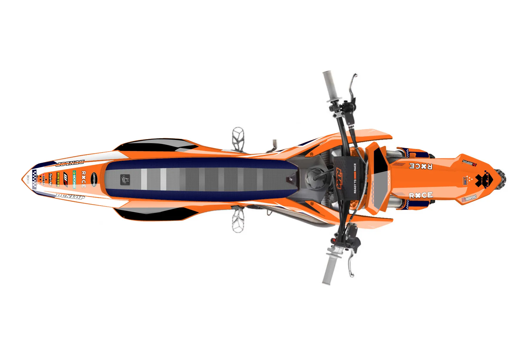«Race» — готовый комплект графики серии Staple для KTM MX Graphic Kit KTM SX 65 2016. В комплекте: графика на бак и боковые облицовки, крылья (переднее и заднее), передний щиток, номерные таблички, защита вилки. Материал: ПВХ-винил 80 мкр с холодной ламинацией 300 мкр, общая толщина 380 мкр; покрытие глянцевое или матовое на выбор. Устойчив к UV-излучению, воде, бензину и мойке высокого давления. Клей акриловый на сольвентной основе — постоянный, для гибких пластиков. На простых поверхностях монтируется без нагрева; для сложных изгибов рекомендуем фен. Этот пресет можно заказать как есть или взять за основу в конструкторе: поменять цвета, добавить стартовый номер и свой бренд. Производство — 3–5 рабочих дней, доставка по России СДЭКом или Почтой, по СНГ — курьерскими службами.
