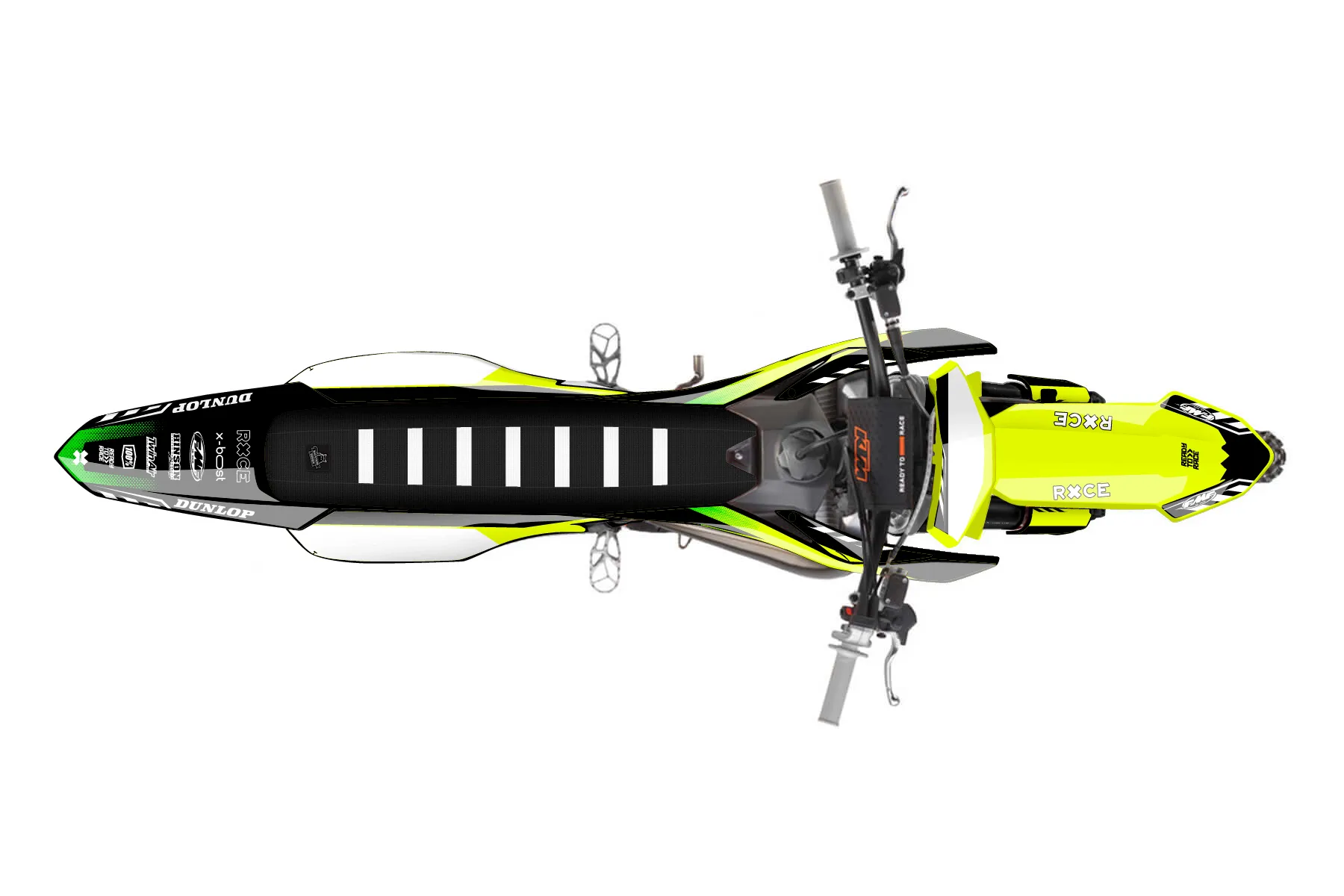 «Volt Neon» — готовый комплект графики серии Maverick для KTM MX Graphic Kit KTM SX 65 2024. В комплекте: графика на бак и боковые облицовки, крылья (переднее и заднее), передний щиток, номерные таблички, защита вилки. Материал: ПВХ-винил 80 мкр с холодной ламинацией 300 мкр, общая толщина 380 мкр; покрытие глянцевое или матовое на выбор. Устойчив к UV-излучению, воде, бензину и мойке высокого давления. Клей акриловый на сольвентной основе — постоянный, для гибких пластиков. На простых поверхностях монтируется без нагрева; для сложных изгибов рекомендуем фен. Этот пресет можно заказать как есть или взять за основу в конструкторе: поменять цвета, добавить стартовый номер и свой бренд. Производство — 3–5 рабочих дней, доставка по России СДЭКом или Почтой, по СНГ — курьерскими службами.