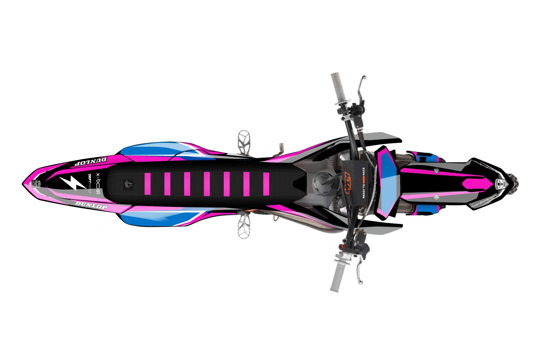 «blue/pink/black» — готовый комплект графики серии Fusion для KTM MX Graphic Kit KTM SX 85 2025. В комплекте: графика на бак и боковые облицовки, крылья (переднее и заднее), передний щиток, номерные таблички, защита вилки. Материал: ПВХ-винил 80 мкр с холодной ламинацией 300 мкр, общая толщина 380 мкр; покрытие глянцевое или матовое на выбор. Устойчив к UV-излучению, воде, бензину и мойке высокого давления. Клей акриловый на сольвентной основе — постоянный, для гибких пластиков. На простых поверхностях монтируется без нагрева; для сложных изгибов рекомендуем фен. Этот пресет можно заказать как есть или взять за основу в конструкторе: поменять цвета, добавить стартовый номер и свой бренд. Производство — 3–5 рабочих дней, доставка по России СДЭКом или Почтой, по СНГ — курьерскими службами.