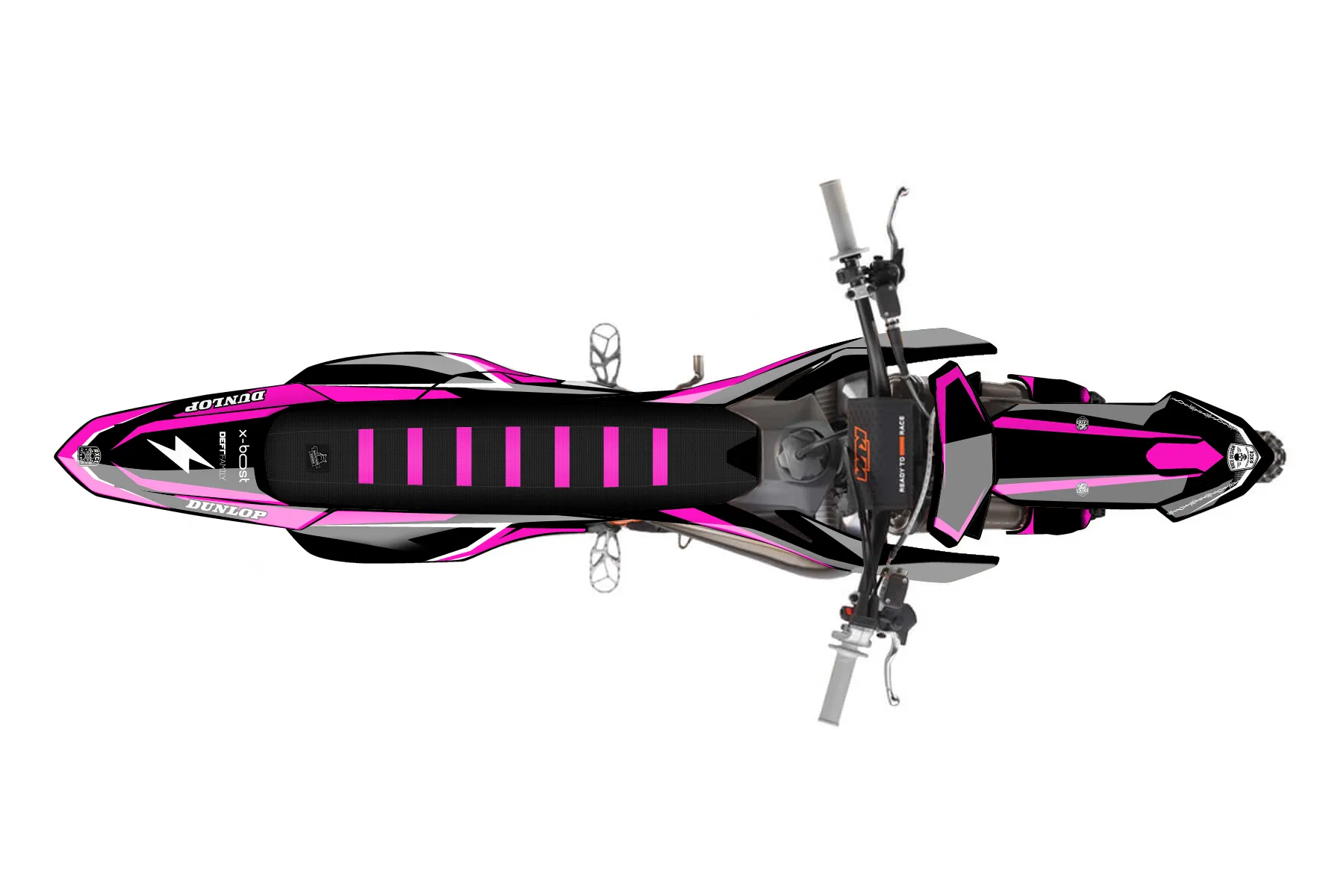 «Extreme» — готовый комплект графики серии Fusion для KTM MX Graphic Kit KTM SX 85 2025. В комплекте: графика на бак и боковые облицовки, крылья (переднее и заднее), передний щиток, номерные таблички, защита вилки. Материал: ПВХ-винил 80 мкр с холодной ламинацией 300 мкр, общая толщина 380 мкр; покрытие глянцевое или матовое на выбор. Устойчив к UV-излучению, воде, бензину и мойке высокого давления. Клей акриловый на сольвентной основе — постоянный, для гибких пластиков. На простых поверхностях монтируется без нагрева; для сложных изгибов рекомендуем фен. Этот пресет можно заказать как есть или взять за основу в конструкторе: поменять цвета, добавить стартовый номер и свой бренд. Производство — 3–5 рабочих дней, доставка по России СДЭКом или Почтой, по СНГ — курьерскими службами.