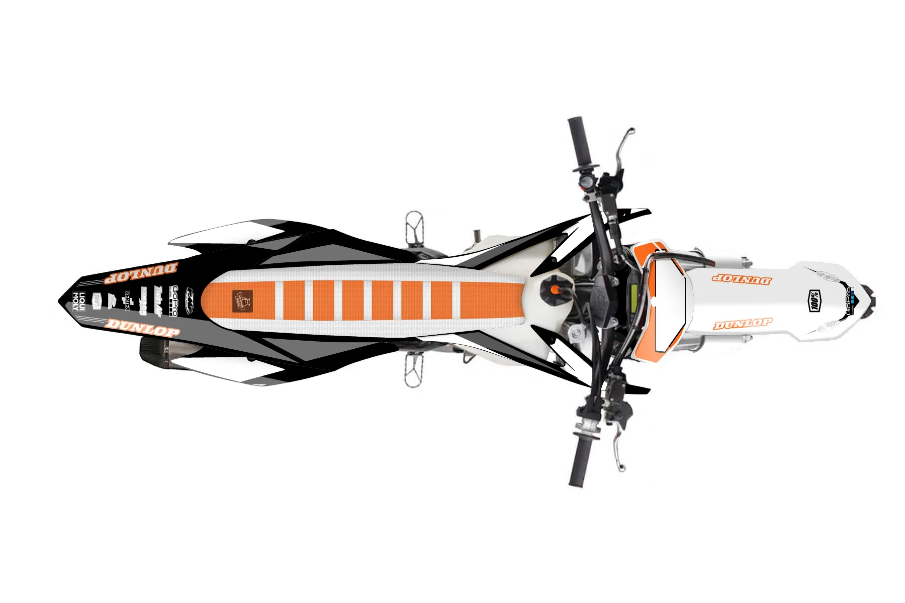 «Finish me » — готовый комплект графики серии Staple для KTM MX Graphic Kit KTM SX-F 250 2013. В комплекте: графика на бак и боковые облицовки, крылья (переднее и заднее), передний щиток, номерные таблички, защита вилки. Материал: ПВХ-винил 80 мкр с холодной ламинацией 300 мкр, общая толщина 380 мкр; покрытие глянцевое или матовое на выбор. Устойчив к UV-излучению, воде, бензину и мойке высокого давления. Клей акриловый на сольвентной основе — постоянный, для гибких пластиков. На простых поверхностях монтируется без нагрева; для сложных изгибов рекомендуем фен. Этот пресет можно заказать как есть или взять за основу в конструкторе: поменять цвета, добавить стартовый номер и свой бренд. Производство — 3–5 рабочих дней, доставка по России СДЭКом или Почтой, по СНГ — курьерскими службами.