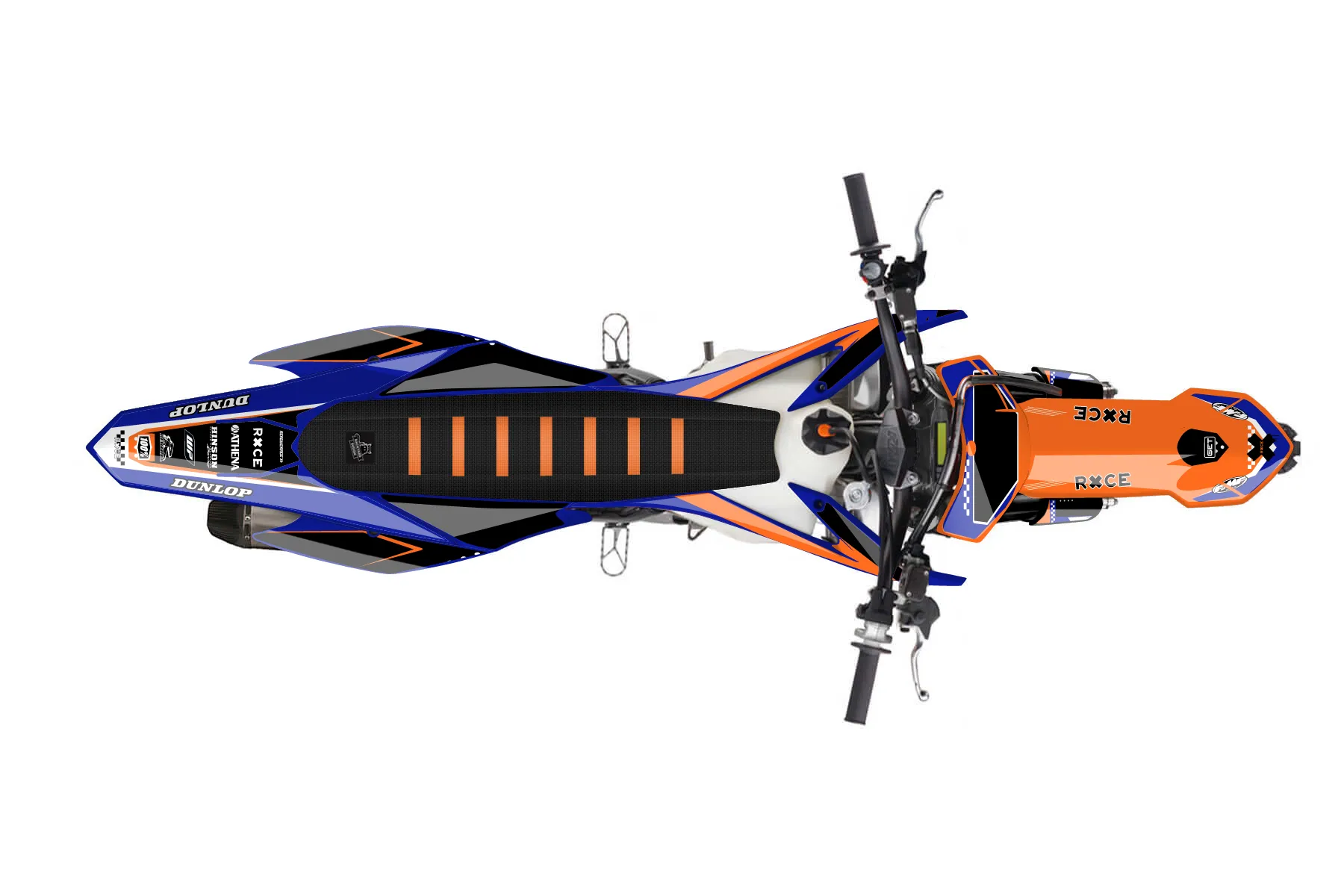 «New Era» — готовый комплект графики серии Staple для KTM MX Graphic Kit KTM SX-F 250 2013. В комплекте: графика на бак и боковые облицовки, крылья (переднее и заднее), передний щиток, номерные таблички, защита вилки. Материал: ПВХ-винил 80 мкр с холодной ламинацией 300 мкр, общая толщина 380 мкр; покрытие глянцевое или матовое на выбор. Устойчив к UV-излучению, воде, бензину и мойке высокого давления. Клей акриловый на сольвентной основе — постоянный, для гибких пластиков. На простых поверхностях монтируется без нагрева; для сложных изгибов рекомендуем фен. Этот пресет можно заказать как есть или взять за основу в конструкторе: поменять цвета, добавить стартовый номер и свой бренд. Производство — 3–5 рабочих дней, доставка по России СДЭКом или Почтой, по СНГ — курьерскими службами.