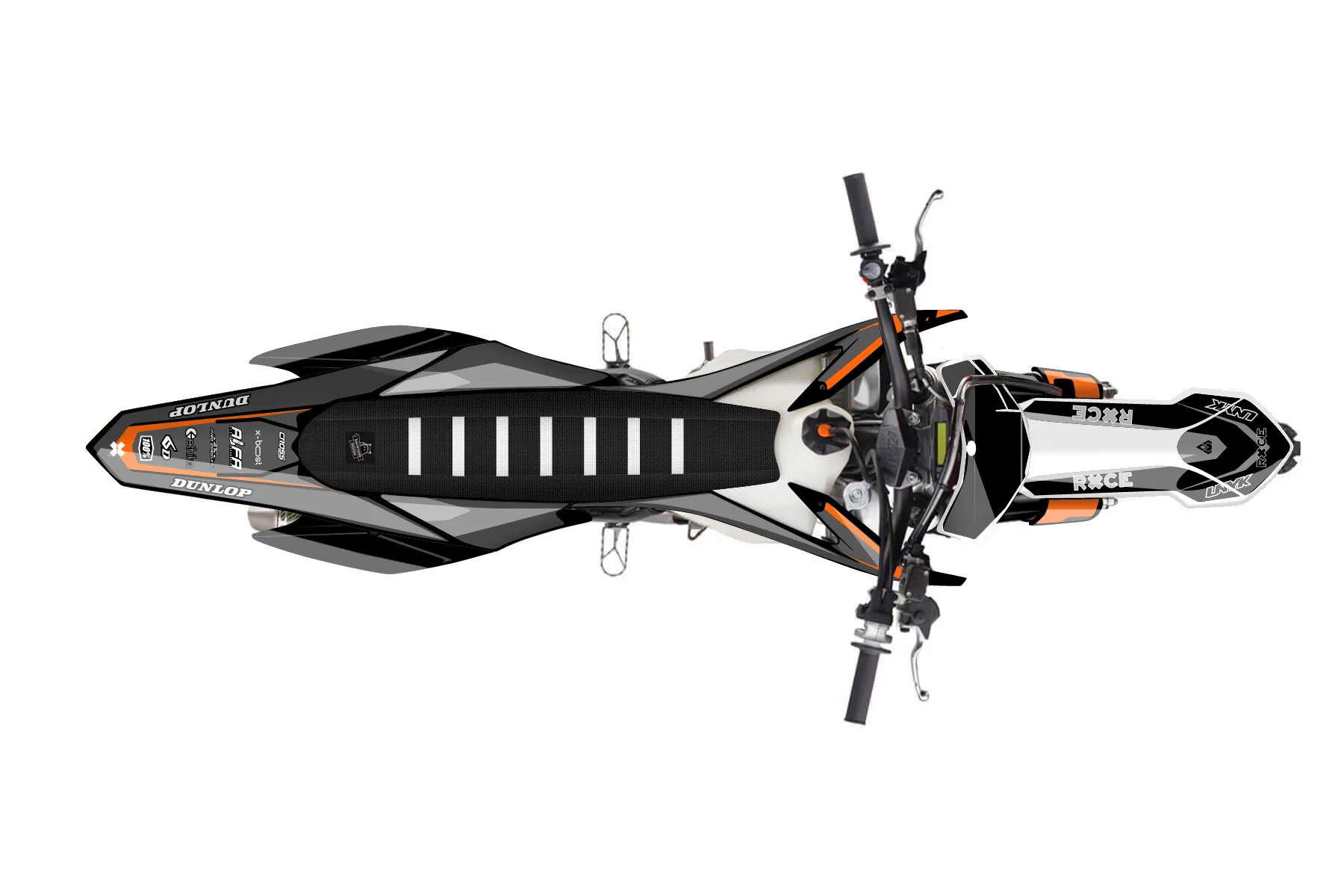 «blackout ktm-250» — готовый комплект графики серии Flow для KTM MX Graphic Kit KTM SX-F 250 2015. В комплекте: графика на бак и боковые облицовки, крылья (переднее и заднее), передний щиток, номерные таблички, защита вилки. Материал: ПВХ-винил 80 мкр с холодной ламинацией 300 мкр, общая толщина 380 мкр; покрытие глянцевое или матовое на выбор. Устойчив к UV-излучению, воде, бензину и мойке высокого давления. Клей акриловый на сольвентной основе — постоянный, для гибких пластиков. На простых поверхностях монтируется без нагрева; для сложных изгибов рекомендуем фен. Этот пресет можно заказать как есть или взять за основу в конструкторе: поменять цвета, добавить стартовый номер и свой бренд. Производство — 3–5 рабочих дней, доставка по России СДЭКом или Почтой, по СНГ — курьерскими службами.