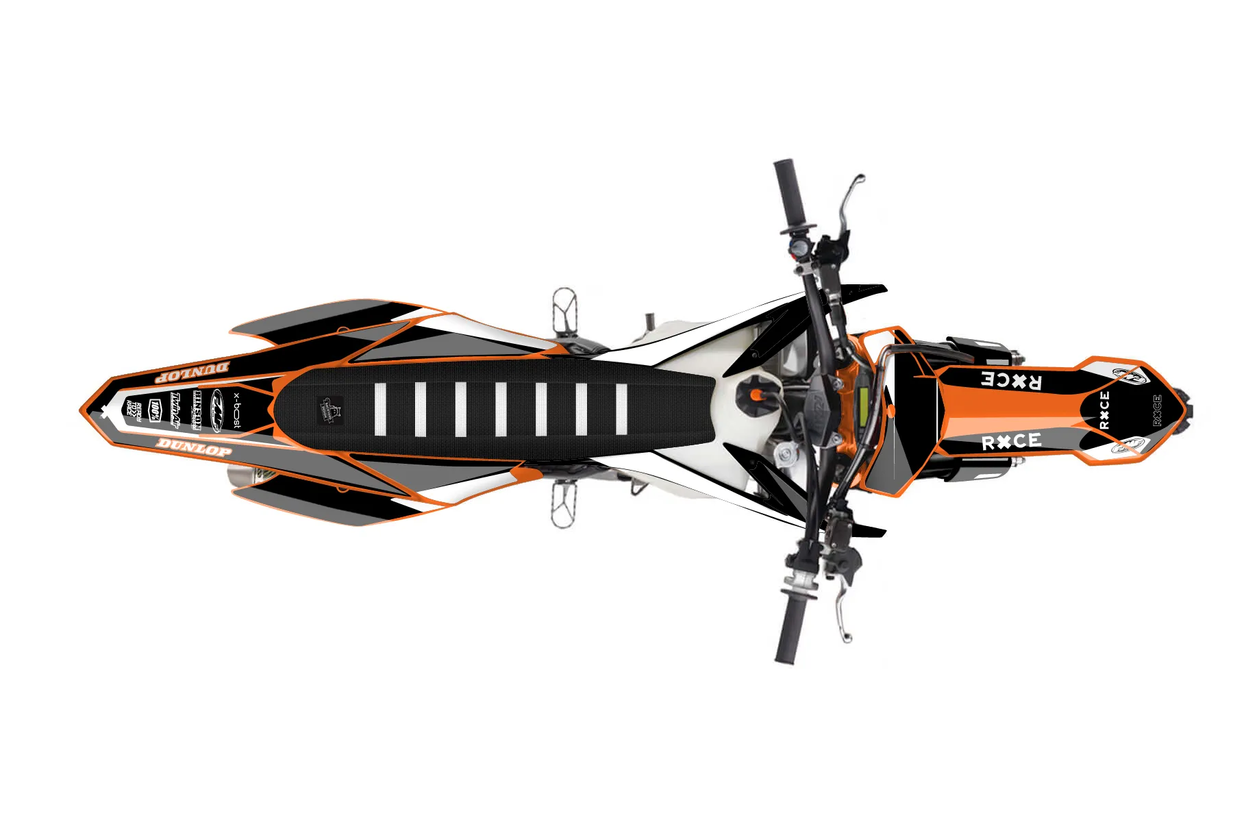«Race» — готовый комплект графики серии Flow для KTM MX Graphic Kit KTM SX-F 250 2015. В комплекте: графика на бак и боковые облицовки, крылья (переднее и заднее), передний щиток, номерные таблички, защита вилки. Материал: ПВХ-винил 80 мкр с холодной ламинацией 300 мкр, общая толщина 380 мкр; покрытие глянцевое или матовое на выбор. Устойчив к UV-излучению, воде, бензину и мойке высокого давления. Клей акриловый на сольвентной основе — постоянный, для гибких пластиков. На простых поверхностях монтируется без нагрева; для сложных изгибов рекомендуем фен. Этот пресет можно заказать как есть или взять за основу в конструкторе: поменять цвета, добавить стартовый номер и свой бренд. Производство — 3–5 рабочих дней, доставка по России СДЭКом или Почтой, по СНГ — курьерскими службами.