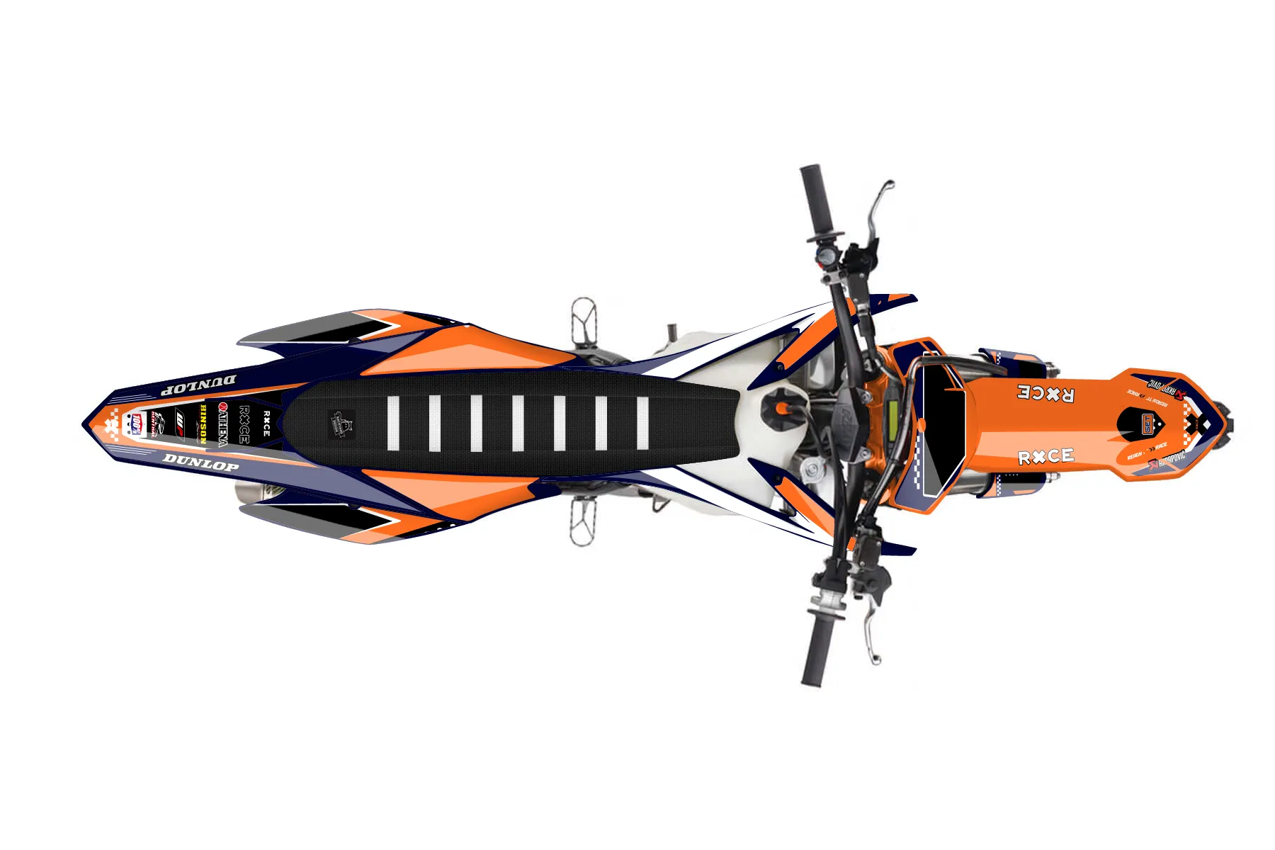 «Rage» — готовый комплект графики серии Staple для KTM MX Graphic Kit KTM SX-F 250 2015. В комплекте: графика на бак и боковые облицовки, крылья (переднее и заднее), передний щиток, номерные таблички, защита вилки. Материал: ПВХ-винил 80 мкр с холодной ламинацией 300 мкр, общая толщина 380 мкр; покрытие глянцевое или матовое на выбор. Устойчив к UV-излучению, воде, бензину и мойке высокого давления. Клей акриловый на сольвентной основе — постоянный, для гибких пластиков. На простых поверхностях монтируется без нагрева; для сложных изгибов рекомендуем фен. Этот пресет можно заказать как есть или взять за основу в конструкторе: поменять цвета, добавить стартовый номер и свой бренд. Производство — 3–5 рабочих дней, доставка по России СДЭКом или Почтой, по СНГ — курьерскими службами.