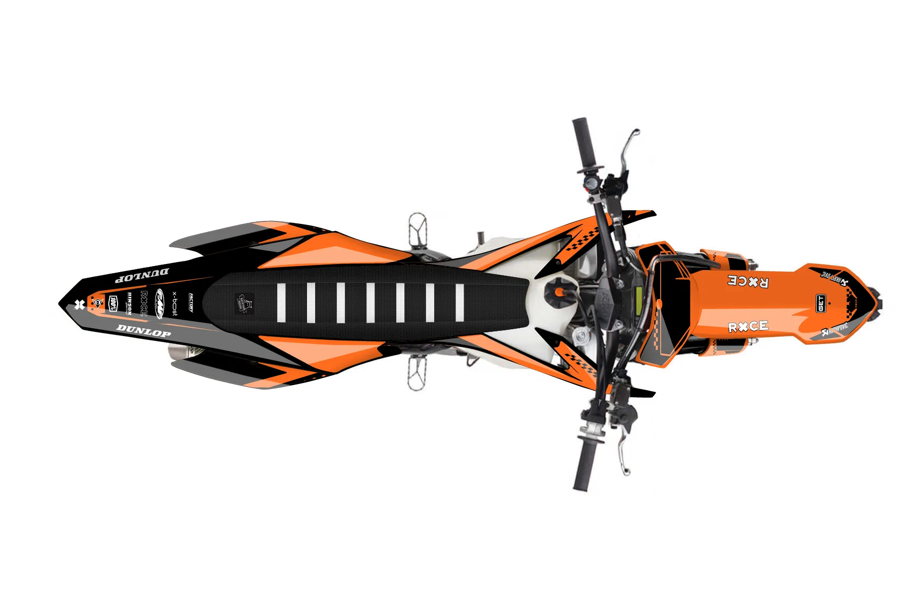 «Trait» — готовый комплект графики серии Staple для KTM MX Graphic Kit KTM SX-F 250 2015. В комплекте: графика на бак и боковые облицовки, крылья (переднее и заднее), передний щиток, номерные таблички, защита вилки. Материал: ПВХ-винил 80 мкр с холодной ламинацией 300 мкр, общая толщина 380 мкр; покрытие глянцевое или матовое на выбор. Устойчив к UV-излучению, воде, бензину и мойке высокого давления. Клей акриловый на сольвентной основе — постоянный, для гибких пластиков. На простых поверхностях монтируется без нагрева; для сложных изгибов рекомендуем фен. Этот пресет можно заказать как есть или взять за основу в конструкторе: поменять цвета, добавить стартовый номер и свой бренд. Производство — 3–5 рабочих дней, доставка по России СДЭКом или Почтой, по СНГ — курьерскими службами.