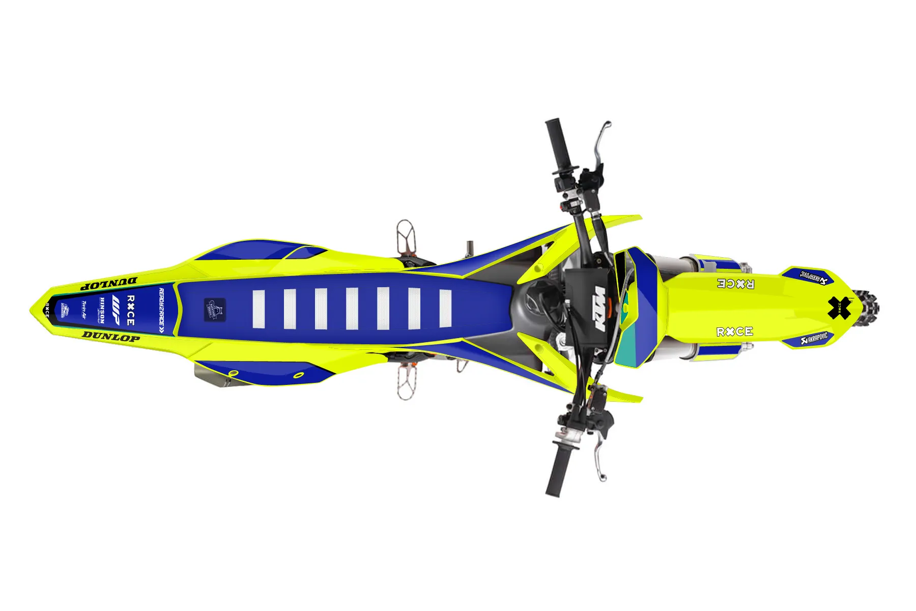«Brilliant Neon» — готовый комплект графики серии Flow для KTM MX Graphic Kit KTM SX-F 250 2016. В комплекте: графика на бак и боковые облицовки, крылья (переднее и заднее), передний щиток, номерные таблички, защита вилки. Материал: ПВХ-винил 80 мкр с холодной ламинацией 300 мкр, общая толщина 380 мкр; покрытие глянцевое или матовое на выбор. Устойчив к UV-излучению, воде, бензину и мойке высокого давления. Клей акриловый на сольвентной основе — постоянный, для гибких пластиков. На простых поверхностях монтируется без нагрева; для сложных изгибов рекомендуем фен. Этот пресет можно заказать как есть или взять за основу в конструкторе: поменять цвета, добавить стартовый номер и свой бренд. Производство — 3–5 рабочих дней, доставка по России СДЭКом или Почтой, по СНГ — курьерскими службами.