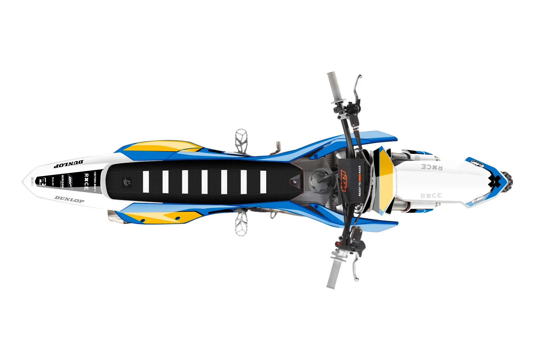 «All-Star» — готовый комплект графики серии Flow для KTM MX Graphic Kit KTM SX-F 250 2023. В комплекте: графика на бак и боковые облицовки, крылья (переднее и заднее), передний щиток, номерные таблички, защита вилки. Материал: ПВХ-винил 80 мкр с холодной ламинацией 300 мкр, общая толщина 380 мкр; покрытие глянцевое или матовое на выбор. Устойчив к UV-излучению, воде, бензину и мойке высокого давления. Клей акриловый на сольвентной основе — постоянный, для гибких пластиков. На простых поверхностях монтируется без нагрева; для сложных изгибов рекомендуем фен. Этот пресет можно заказать как есть или взять за основу в конструкторе: поменять цвета, добавить стартовый номер и свой бренд. Производство — 3–5 рабочих дней, доставка по России СДЭКом или Почтой, по СНГ — курьерскими службами.