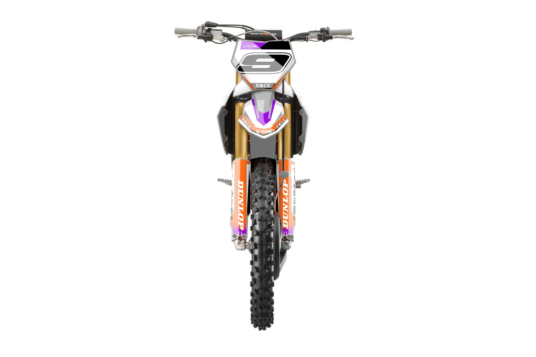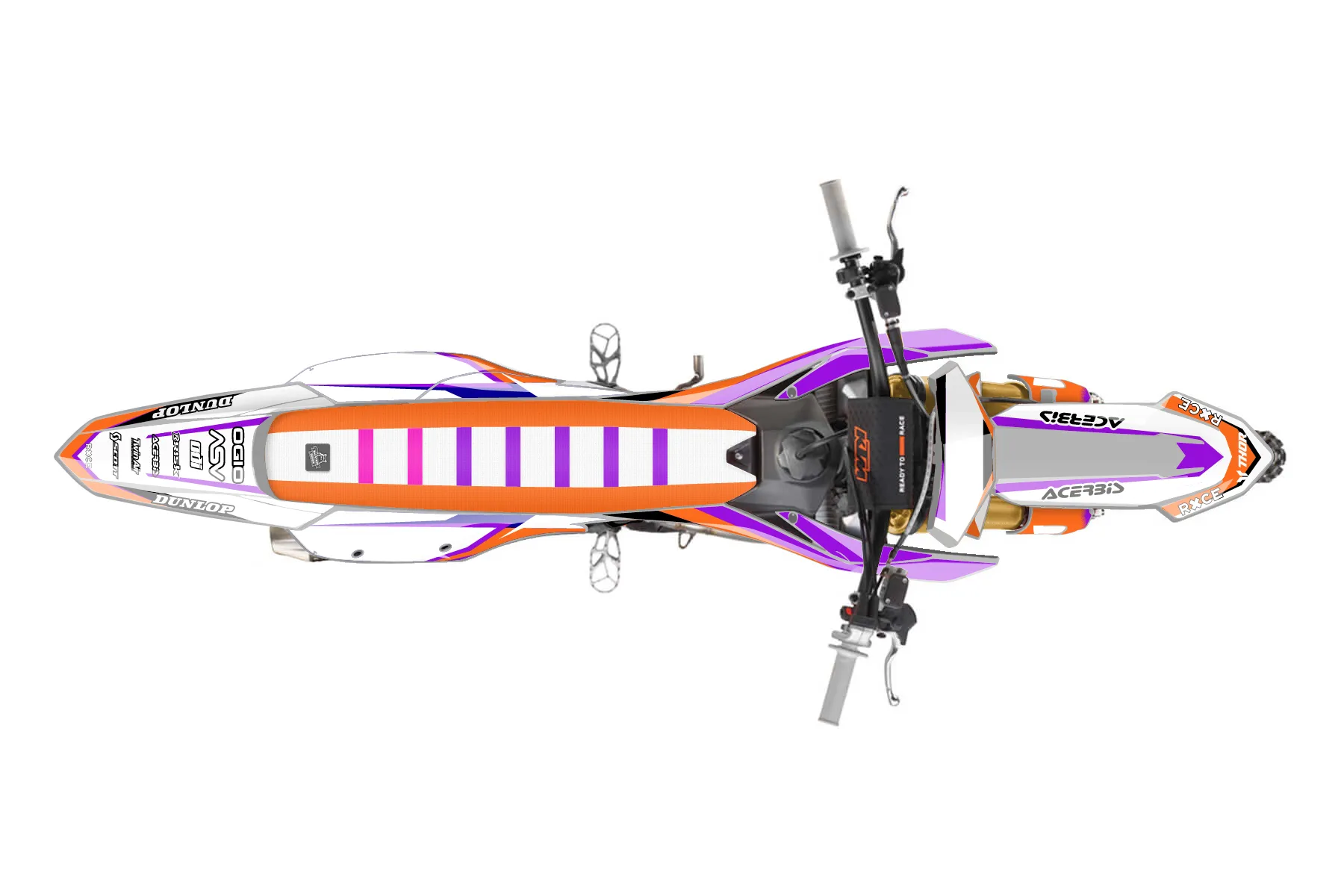«fully finished purple graphics» — готовый комплект графики серии Fusion для KTM MX Graphic Kit KTM SX-F 250 2023. В комплекте: графика на бак и боковые облицовки, крылья (переднее и заднее), передний щиток, номерные таблички, защита вилки. Материал: ПВХ-винил 80 мкр с холодной ламинацией 300 мкр, общая толщина 380 мкр; покрытие глянцевое или матовое на выбор. Устойчив к UV-излучению, воде, бензину и мойке высокого давления. Клей акриловый на сольвентной основе — постоянный, для гибких пластиков. На простых поверхностях монтируется без нагрева; для сложных изгибов рекомендуем фен. Этот пресет можно заказать как есть или взять за основу в конструкторе: поменять цвета, добавить стартовый номер и свой бренд. Производство — 3–5 рабочих дней, доставка по России СДЭКом или Почтой, по СНГ — курьерскими службами.