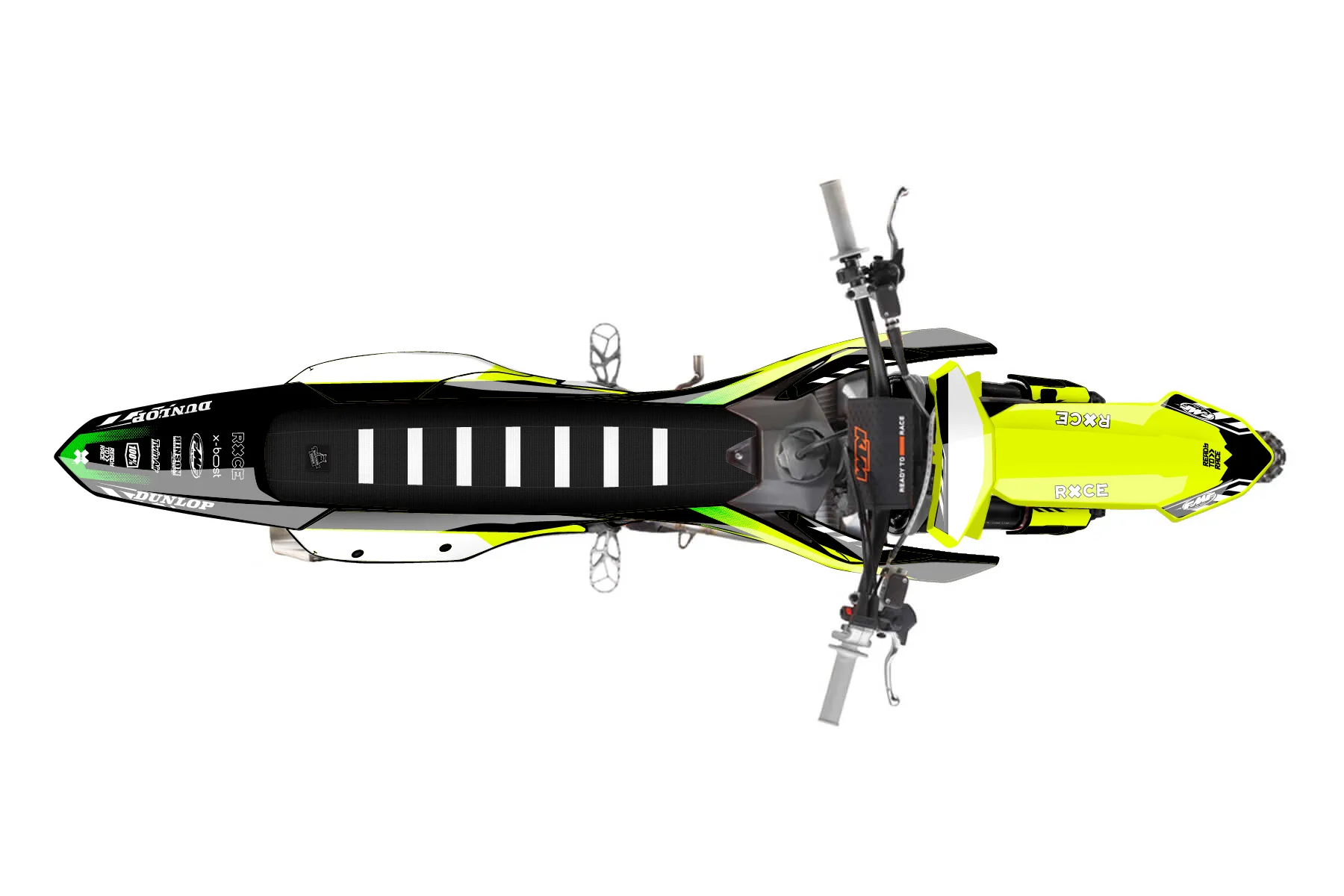 «Volt Neon» — готовый комплект графики серии Maverick для KTM MX Graphic Kit KTM SX-F 250 2023. В комплекте: графика на бак и боковые облицовки, крылья (переднее и заднее), передний щиток, номерные таблички, защита вилки. Материал: ПВХ-винил 80 мкр с холодной ламинацией 300 мкр, общая толщина 380 мкр; покрытие глянцевое или матовое на выбор. Устойчив к UV-излучению, воде, бензину и мойке высокого давления. Клей акриловый на сольвентной основе — постоянный, для гибких пластиков. На простых поверхностях монтируется без нагрева; для сложных изгибов рекомендуем фен. Этот пресет можно заказать как есть или взять за основу в конструкторе: поменять цвета, добавить стартовый номер и свой бренд. Производство — 3–5 рабочих дней, доставка по России СДЭКом или Почтой, по СНГ — курьерскими службами.